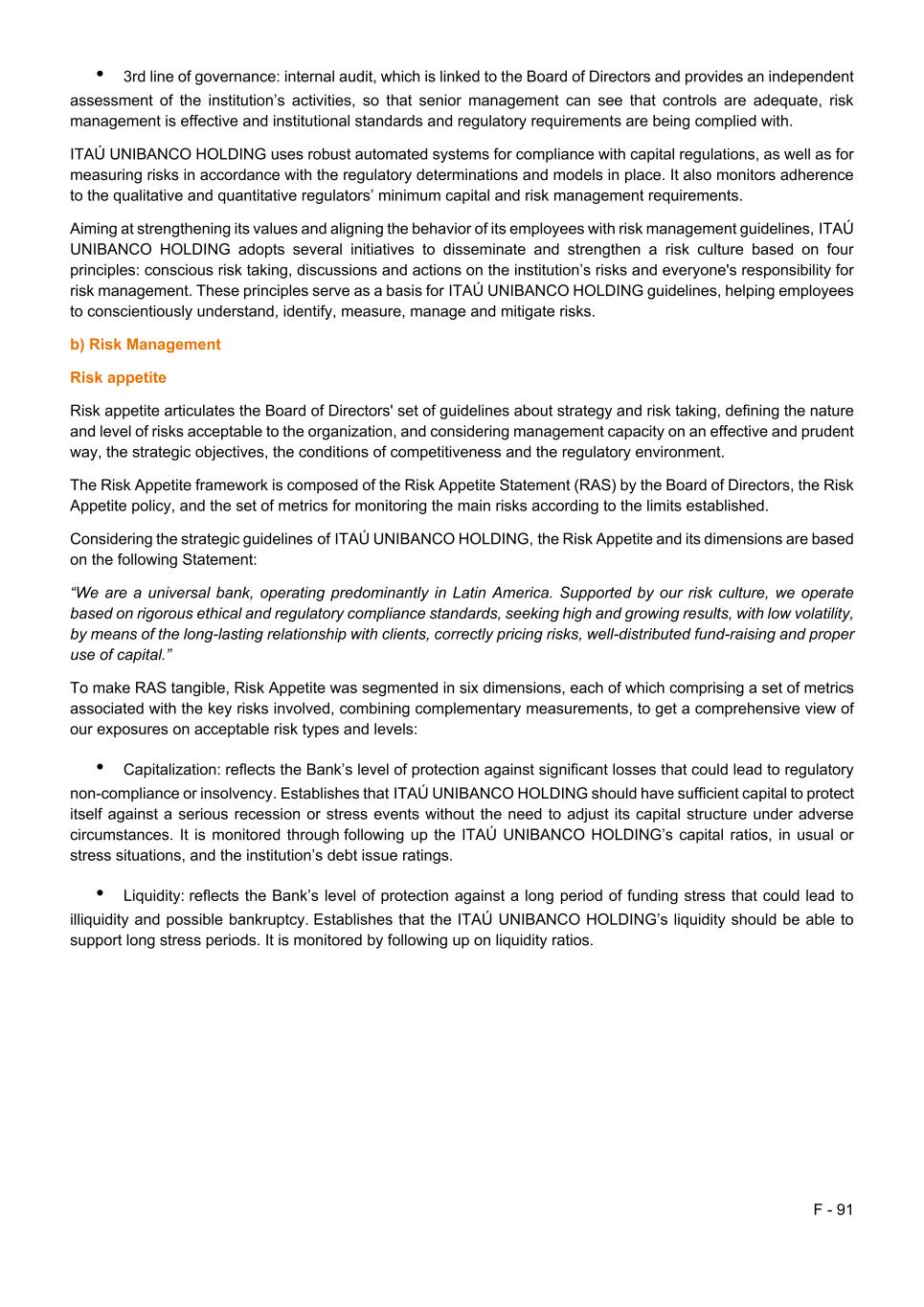 F - 91 • 3rd line of governance: internal audit, which is linked to the Board of Directors and provides an independent assessment of the institution’s activities, so that senior management can see that controls are adequate, risk management is effective and institutional standards and regulatory requirements are being complied with. ITAÚ UNIBANCO HOLDING uses robust automated systems for compliance with capital regulations, as well as for measuring risks in accordance with the regulatory determinations and models in place. It also monitors adherence to the qualitative and quantitative regulators’ minimum capital and risk management requirements. Aiming at strengthening its values and aligning the behavior of its employees with risk management guidelines, ITAÚ UNIBANCO HOLDING adopts several initiatives to disseminate and strengthen a risk culture based on four principles: conscious risk taking, discussions and actions on the institution’s risks and everyone's responsibility for risk management. These principles serve as a basis for ITAÚ UNIBANCO HOLDING guidelines, helping employees to conscientiously understand, identify, measure, manage and mitigate risks. b) Risk Management Risk appetite Risk appetite articulates the Board of Directors' set of guidelines about strategy and risk taking, defining the nature and level of risks acceptable to the organization, and considering management capacity on an effective and prudent way, the strategic objectives, the conditions of competitiveness and the regulatory environment. The Risk Appetite framework is composed of the Risk Appetite Statement (RAS) by the Board of Directors, the Risk Appetite policy, and the set of metrics for monitoring the main risks according to the limits established. Considering the strategic guidelines of ITAÚ UNIBANCO HOLDING, the Risk Appetite and its dimensions are based on the following Statement: “We are a universal bank, operating predominantly in Latin America. Supported by our risk culture, we operate based on rigorous ethical and regulatory compliance standards, seeking high and growing results, with low volatility, by means of the long-lasting relationship with clients, correctly pricing risks, well-distributed fund-raising and proper use of capital.” To make RAS tangible, Risk Appetite was segmented in six dimensions, each of which comprising a set of metrics associated with the key risks involved, combining complementary measurements, to get a comprehensive view of our exposures on acceptable risk types and levels: • Capitalization: reflects the Bank’s level of protection against significant losses that could lead to regulatory non-compliance or insolvency. Establishes that ITAÚ UNIBANCO HOLDING should have sufficient capital to protect itself against a serious recession or stress events without the need to adjust its capital structure under adverse circumstances. It is monitored through following up the ITAÚ UNIBANCO HOLDING’s capital ratios, in usual or stress situations, and the institution’s debt issue ratings. • Liquidity: reflects the Bank’s level of protection against a long period of funding stress that could lead to illiquidity and possible bankruptcy. Establishes that the ITAÚ UNIBANCO HOLDING’s liquidity should be able to support long stress periods. It is monitored by following up on liquidity ratios.