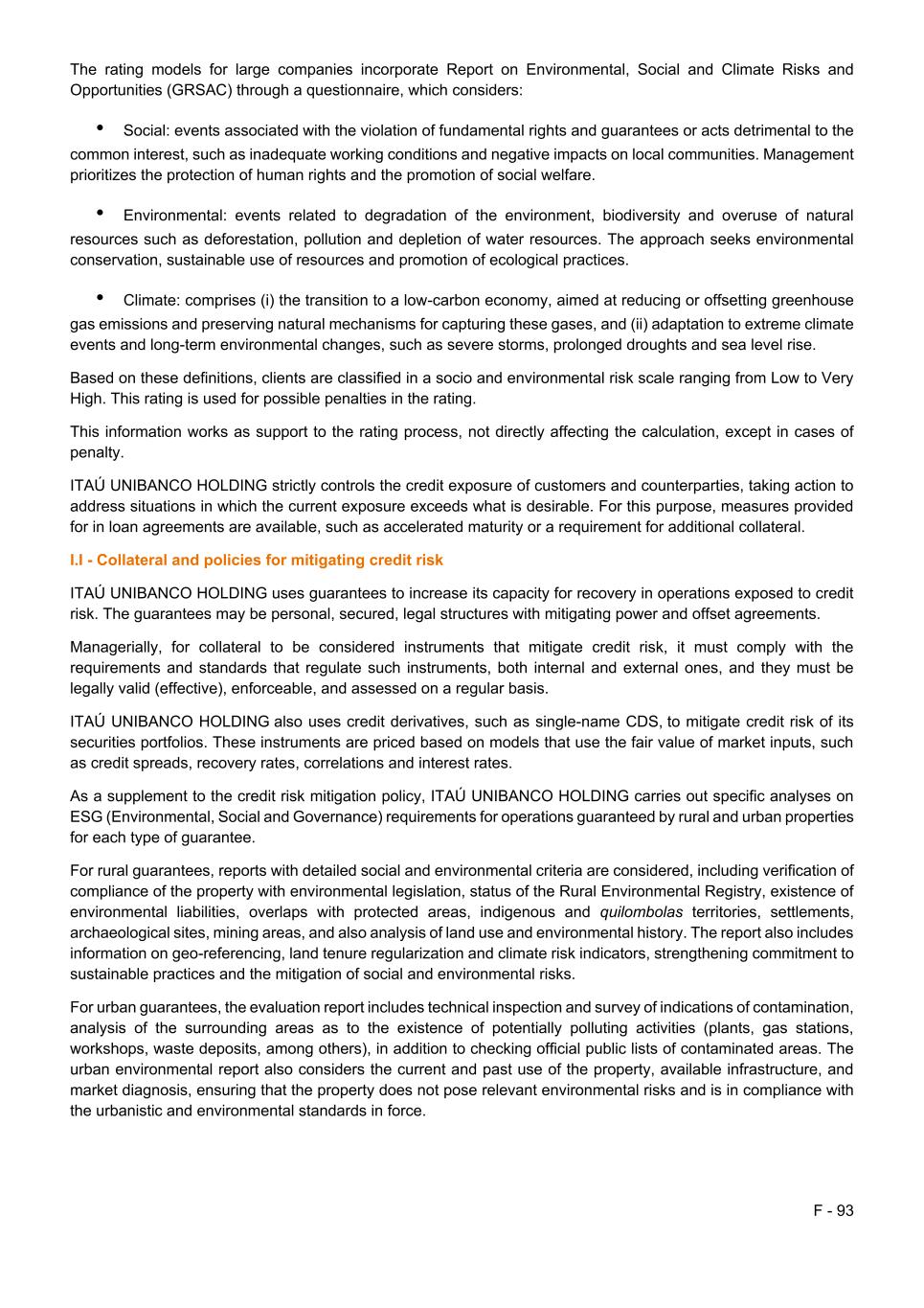 F - 93 The rating models for large companies incorporate Report on Environmental, Social and Climate Risks and Opportunities (GRSAC) through a questionnaire, which considers: • Social: events associated with the violation of fundamental rights and guarantees or acts detrimental to the common interest, such as inadequate working conditions and negative impacts on local communities. Management prioritizes the protection of human rights and the promotion of social welfare. • Environmental: events related to degradation of the environment, biodiversity and overuse of natural resources such as deforestation, pollution and depletion of water resources. The approach seeks environmental conservation, sustainable use of resources and promotion of ecological practices. • Climate: comprises (i) the transition to a low-carbon economy, aimed at reducing or offsetting greenhouse gas emissions and preserving natural mechanisms for capturing these gases, and (ii) adaptation to extreme climate events and long-term environmental changes, such as severe storms, prolonged droughts and sea level rise. Based on these definitions, clients are classified in a socio and environmental risk scale ranging from Low to Very High. This rating is used for possible penalties in the rating. This information works as support to the rating process, not directly affecting the calculation, except in cases of penalty. ITAÚ UNIBANCO HOLDING strictly controls the credit exposure of customers and counterparties, taking action to address situations in which the current exposure exceeds what is desirable. For this purpose, measures provided for in loan agreements are available, such as accelerated maturity or a requirement for additional collateral. I.I - Collateral and policies for mitigating credit risk ITAÚ UNIBANCO HOLDING uses guarantees to increase its capacity for recovery in operations exposed to credit risk. The guarantees may be personal, secured, legal structures with mitigating power and offset agreements. Managerially, for collateral to be considered instruments that mitigate credit risk, it must comply with the requirements and standards that regulate such instruments, both internal and external ones, and they must be legally valid (effective), enforceable, and assessed on a regular basis. ITAÚ UNIBANCO HOLDING also uses credit derivatives, such as single-name CDS, to mitigate credit risk of its securities portfolios. These instruments are priced based on models that use the fair value of market inputs, such as credit spreads, recovery rates, correlations and interest rates. As a supplement to the credit risk mitigation policy, ITAÚ UNIBANCO HOLDING carries out specific analyses on ESG (Environmental, Social and Governance) requirements for operations guaranteed by rural and urban properties for each type of guarantee. For rural guarantees, reports with detailed social and environmental criteria are considered, including verification of compliance of the property with environmental legislation, status of the Rural Environmental Registry, existence of environmental liabilities, overlaps with protected areas, indigenous and quilombolas territories, settlements, archaeological sites, mining areas, and also analysis of land use and environmental history. The report also includes information on geo-referencing, land tenure regularization and climate risk indicators, strengthening commitment to sustainable practices and the mitigation of social and environmental risks. For urban guarantees, the evaluation report includes technical inspection and survey of indications of contamination, analysis of the surrounding areas as to the existence of potentially polluting activities (plants, gas stations, workshops, waste deposits, among others), in addition to checking official public lists of contaminated areas. The urban environmental report also considers the current and past use of the property, available infrastructure, and market diagnosis, ensuring that the property does not pose relevant environmental risks and is in compliance with the urbanistic and environmental standards in force.