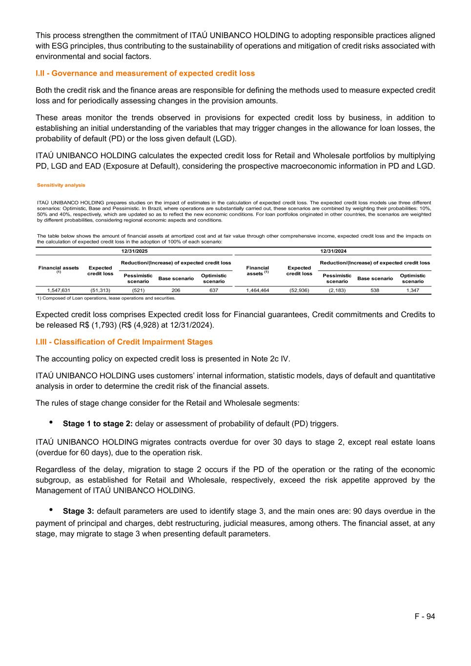 F - 94 This process strengthen the commitment of ITAÚ UNIBANCO HOLDING to adopting responsible practices aligned with ESG principles, thus contributing to the sustainability of operations and mitigation of credit risks associated with environmental and social factors. I.II - Governance and measurement of expected credit loss Both the credit risk and the finance areas are responsible for defining the methods used to measure expected credit loss and for periodically assessing changes in the provision amounts. These areas monitor the trends observed in provisions for expected credit loss by business, in addition to establishing an initial understanding of the variables that may trigger changes in the allowance for loan losses, the probability of default (PD) or the loss given default (LGD). ITAÚ UNIBANCO HOLDING calculates the expected credit loss for Retail and Wholesale portfolios by multiplying PD, LGD and EAD (Exposure at Default), considering the prospective macroeconomic information in PD and LGD. Sensitivity analysis ITAÚ UNIBANCO HOLDING prepares studies on the impact of estimates in the calculation of expected credit loss. The expected credit loss models use three different scenarios: Optimistic, Base and Pessimistic. In Brazil, where operations are substantially carried out, these scenarios are combined by weighting their probabilities: 10%, 50% and 40%, respectively, which are updated so as to reflect the new economic conditions. For loan portfolios originated in other countries, the scenarios are weighted by different probabilities, considering regional economic aspects and conditions. The table below shows the amount of financial assets at amortized cost and at fair value through other comprehensive income, expected credit loss and the impacts on the calculation of expected credit loss in the adoption of 100% of each scenario: 12/31/2025 12/31/2024 Financial assets (1) Expected credit loss Reduction/(Increase) of expected credit loss Financial assets (1) Expected credit loss Reduction/(Increase) of expected credit loss Pessimistic scenario Base scenario Optimistic scenario Pessimistic scenario Base scenario Optimistic scenario 1,547,631 (51,313) (521) 206 637 1,464,464 (52,936) (2,183) 538 1,347 1) Composed of Loan operations, lease operations and securities. Expected credit loss comprises Expected credit loss for Financial guarantees, Credit commitments and Credits to be released R$ (1,793) (R$ (4,928) at 12/31/2024). I.III - Classification of Credit Impairment Stages The accounting policy on expected credit loss is presented in Note 2c IV. ITAÚ UNIBANCO HOLDING uses customers’ internal information, statistic models, days of default and quantitative analysis in order to determine the credit risk of the financial assets. The rules of stage change consider for the Retail and Wholesale segments: • Stage 1 to stage 2: delay or assessment of probability of default (PD) triggers. ITAÚ UNIBANCO HOLDING migrates contracts overdue for over 30 days to stage 2, except real estate loans (overdue for 60 days), due to the operation risk. Regardless of the delay, migration to stage 2 occurs if the PD of the operation or the rating of the economic subgroup, as established for Retail and Wholesale, respectively, exceed the risk appetite approved by the Management of ITAÚ UNIBANCO HOLDING. • Stage 3: default parameters are used to identify stage 3, and the main ones are: 90 days overdue in the payment of principal and charges, debt restructuring, judicial measures, among others. The financial asset, at any stage, may migrate to stage 3 when presenting default parameters.