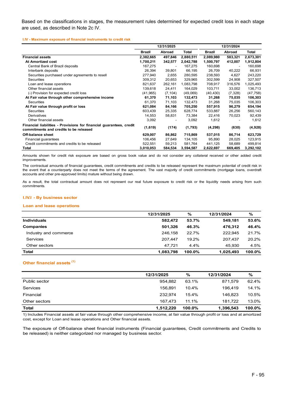 F - 95 Based on the classifications in stages, the measurement rules determined for expected credit loss in each stage are used, as described in Note 2c IV. I.IV - Maximum exposure of financial instruments to credit risk 12/31/2025 12/31/2024 Brazil Abroad Total Brazil Abroad Total Financial assets 2,382,665 497,846 2,880,511 2,089,980 583,321 2,673,301 At Amortized cost 1,700,211 342,577 2,042,788 1,500,797 412,007 1,912,804 Central Bank of Brazil deposits 167,275 - 167,275 160,698 - 160,698 Interbank deposits 26,394 39,801 66,195 26,709 40,222 66,931 Securities purchased under agreements to resell 277,940 2,655 280,595 238,593 4,627 243,220 Securities 309,312 20,653 329,965 302,599 24,908 327,507 Loan and lease operations 821,637 262,161 1,083,798 708,917 316,576 1,025,493 Other financial assets 139,618 24,411 164,029 103,711 33,002 136,713 (-) Provision for expected credit loss (41,965) (7,104) (49,069) (40,430) (7,328) (47,758) At Fair value through other comprehensive income 61,370 71,103 132,473 31,268 75,035 106,303 Securities 61,370 71,103 132,473 31,268 75,035 106,303 At Fair value through profit or loss 621,084 84,166 705,250 557,915 96,279 654,194 Securities 603,439 25,335 628,774 533,887 26,256 560,143 Derivatives 14,553 58,831 73,384 22,416 70,023 92,439 Other financial assets 3,092 - 3,092 1,612 - 1,612 Financial liabilities - Provisions for financial guarantees, credit commitments and credits to be released (1,619) (174) (1,793) (4,298) (630) (4,928) Off-balance sheet 629,007 86,862 715,869 537,015 86,714 623,729 Financial guarantees 106,456 27,649 134,105 95,890 28,025 123,915 Credit commitments and credits to be released 522,551 59,213 581,764 441,125 58,689 499,814 Total 3,010,053 584,534 3,594,587 2,622,697 669,405 3,292,102 Amounts shown for credit risk exposure are based on gross book value and do not consider any collateral received or other added credit improvements. The contractual amounts of financial guarantees, credit commitments and credits to be released represent the maximum potential of credit risk in the event that a counterparty does not meet the terms of the agreement. The vast majority of credit commitments (mortgage loans, overdraft accounts and other pre-approved limits) mature without being drawn. As a result, the total contractual amount does not represent our real future exposure to credit risk or the liquidity needs arising from such commitments. I.IV.I - By business sector Loan and lease operations 12/31/2025 % 12/31/2024 % Individuals 582,472 53.7% 549,181 53.6% Companies 501,326 46.3% 476,312 46.4% Industry and commerce 246,158 22.7% 222,945 21.7% Services 207,447 19.2% 207,437 20.2% Other sectors 47,721 4.4% 45,930 4.5% Total 1,083,798 100.0% 1,025,493 100.0% Other financial assets (1) 12/31/2025 % 12/31/2024 % Public sector 954,882 63.1% 871,579 62.4% Services 156,891 10.4% 196,419 14.1% Financial 232,974 15.4% 146,823 10.5% Other sectors 167,473 11.1% 181,722 13.0% Total 1,512,220 100.0% 1,396,543 100.0% 1) Includes Financial assets at fair value through other comprehensive income, at fair value through profit or loss and at amortized cost, except for Loan and lease operations and Other financial assets. The exposure of Off-balance sheet financial instruments (Financial guarantees, Credit commitments and Credits to be released) is neither categorized nor managed by business sector.