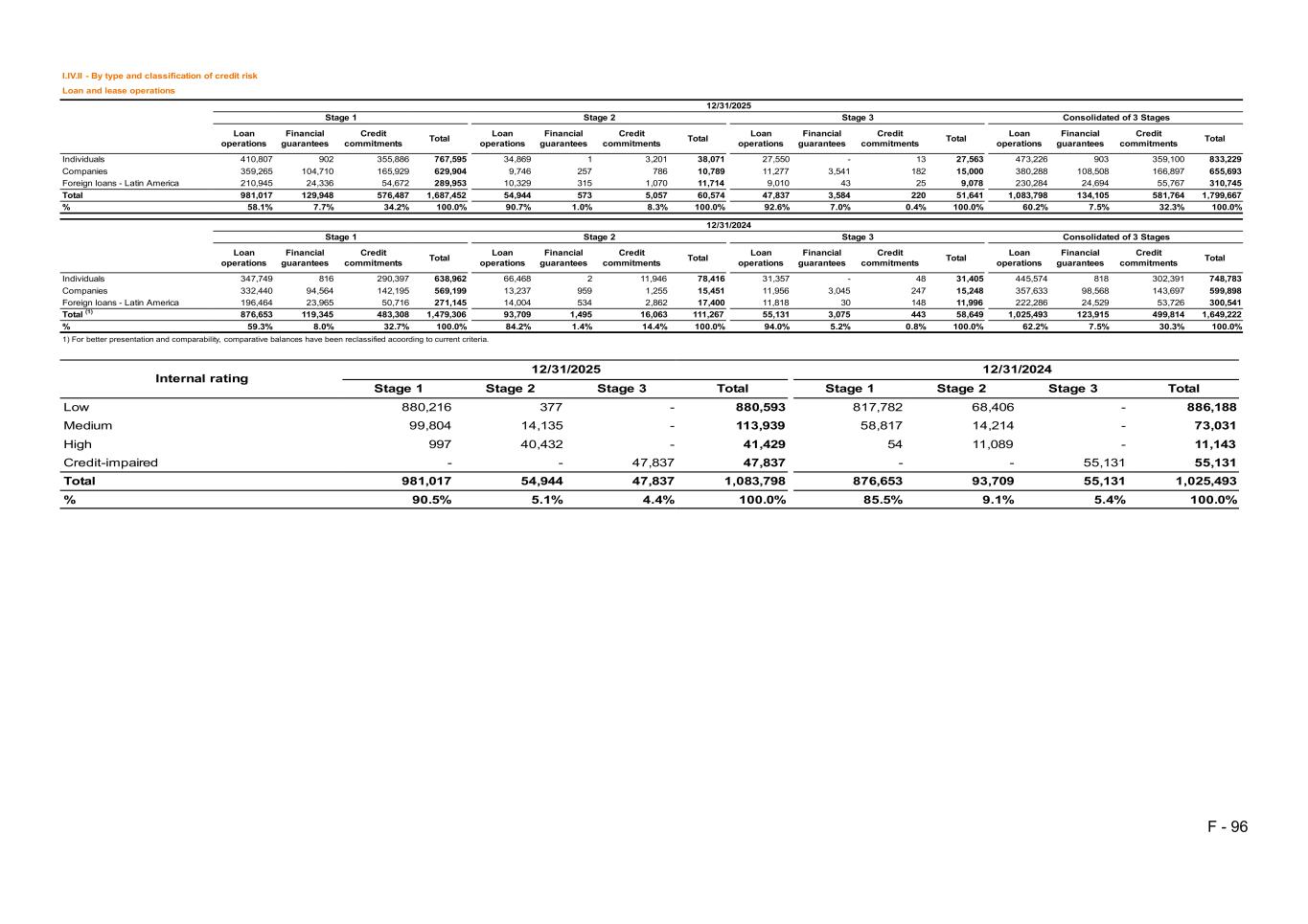 F - 96 I.IV.II - By type and classification of credit risk Loan and lease operations 12/31/2025 Stage 1 Stage 2 Stage 3 Consolidated of 3 Stages Loan operations Financial guarantees Credit commitments Total Loan operations Financial guarantees Credit commitments Total Loan operations Financial guarantees Credit commitments Total Loan operations Financial guarantees Credit commitments Total Individuals 410,807 902 355,886 767,595 34,869 1 3,201 38,071 27,550 - 13 27,563 473,226 903 359,100 833,229 Companies 359,265 104,710 165,929 629,904 9,746 257 786 10,789 11,277 3,541 182 15,000 380,288 108,508 166,897 655,693 Foreign loans - Latin America 210,945 24,336 54,672 289,953 10,329 315 1,070 11,714 9,010 43 25 9,078 230,284 24,694 55,767 310,745 Total 981,017 129,948 576,487 1,687,452 54,944 573 5,057 60,574 47,837 3,584 220 51,641 1,083,798 134,105 581,764 1,799,667 % 58.1% 7.7% 34.2% 100.0% 90.7% 1.0% 8.3% 100.0% 92.6% 7.0% 0.4% 100.0% 60.2% 7.5% 32.3% 100.0% 12/31/2024 Stage 1 Stage 2 Stage 3 Consolidated of 3 Stages Loan operations Financial guarantees Credit commitments Total Loan operations Financial guarantees Credit commitments Total Loan operations Financial guarantees Credit commitments Total Loan operations Financial guarantees Credit commitments Total Individuals 347,749 816 290,397 638,962 66,468 2 11,946 78,416 31,357 - 48 31,405 445,574 818 302,391 748,783 Companies 332,440 94,564 142,195 569,199 13,237 959 1,255 15,451 11,956 3,045 247 15,248 357,633 98,568 143,697 599,898 Foreign loans - Latin America 196,464 23,965 50,716 271,145 14,004 534 2,862 17,400 11,818 30 148 11,996 222,286 24,529 53,726 300,541 Total (1) 876,653 119,345 483,308 1,479,306 93,709 1,495 16,063 111,267 55,131 3,075 443 58,649 1,025,493 123,915 499,814 1,649,222 % 59.3% 8.0% 32.7% 100.0% 84.2% 1.4% 14.4% 100.0% 94.0% 5.2% 0.8% 100.0% 62.2% 7.5% 30.3% 100.0% 1) For better presentation and comparability, comparative balances have been reclassified acoording to current criteria. Internal rating 12/31/2025 12/31/2024 Stage 1 Stage 2 Stage 3 Total Stage 1 Stage 2 Stage 3 Total Low 880,216 377 - 880,593 817,782 68,406 - 886,188 Medium 99,804 14,135 - 113,939 58,817 14,214 - 73,031 High 997 40,432 - 41,429 54 11,089 - 11,143 Credit-impaired - - 47,837 47,837 - - 55,131 55,131 Total 981,017 54,944 47,837 1,083,798 876,653 93,709 55,131 1,025,493 % 90.5% 5.1% 4.4% 100.0% 85.5% 9.1% 5.4% 100.0%