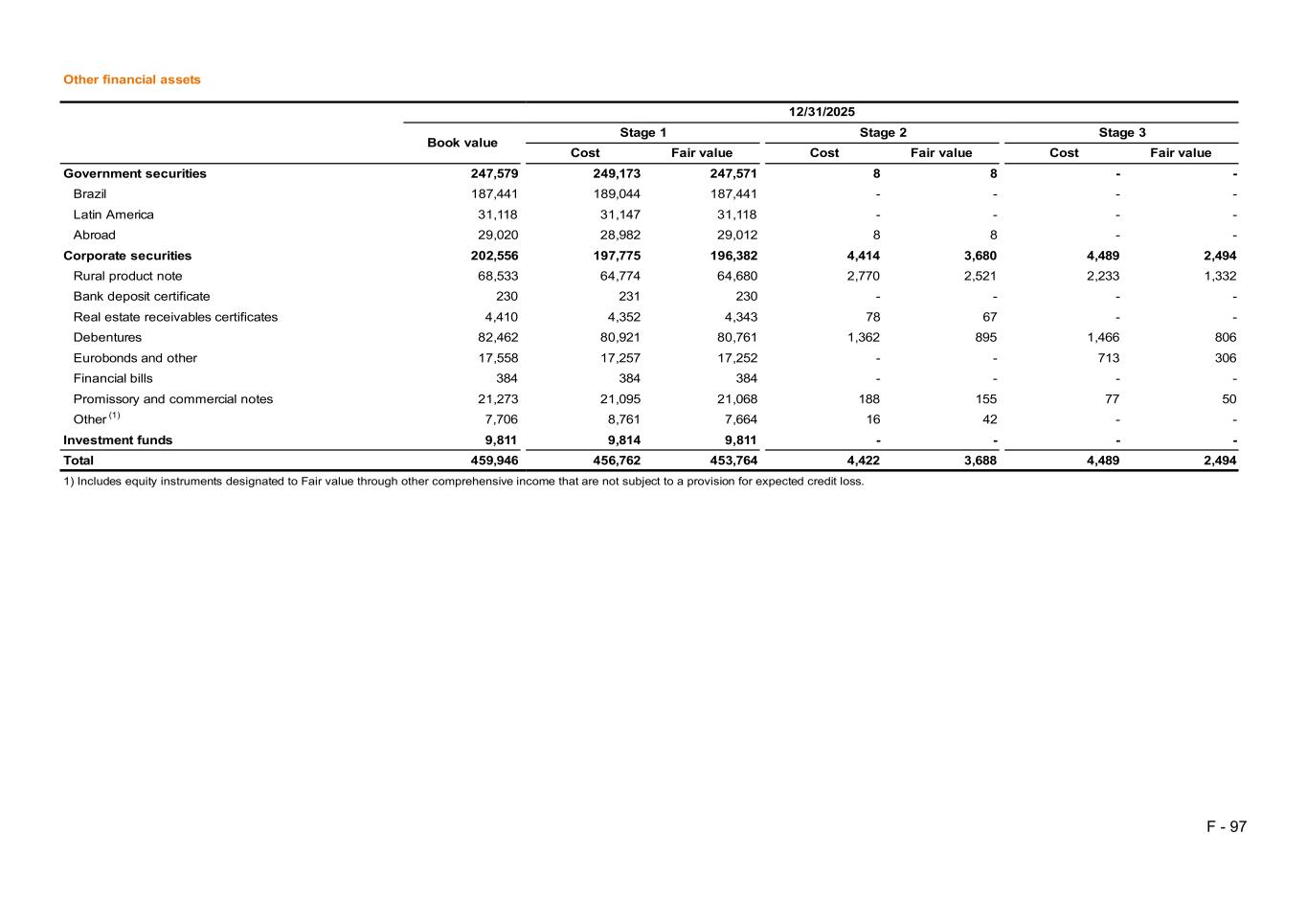 F - 97 Other financial assets 12/31/2025 Book value Stage 1 Stage 2 Stage 3 Cost Fair value Cost Fair value Cost Fair value Government securities 247,579 249,173 247,571 8 8 - - Brazil 187,441 189,044 187,441 - - - - Latin America 31,118 31,147 31,118 - - - - Abroad 29,020 28,982 29,012 8 8 - - Corporate securities 202,556 197,775 196,382 4,414 3,680 4,489 2,494 Rural product note 68,533 64,774 64,680 2,770 2,521 2,233 1,332 Bank deposit certificate 230 231 230 - - - - Real estate receivables certificates 4,410 4,352 4,343 78 67 - - Debentures 82,462 80,921 80,761 1,362 895 1,466 806 Eurobonds and other 17,558 17,257 17,252 - - 713 306 Financial bills 384 384 384 - - - - Promissory and commercial notes 21,273 21,095 21,068 188 155 77 50 Other (1) 7,706 8,761 7,664 16 42 - - Investment funds 9,811 9,814 9,811 - - - - Total 459,946 456,762 453,764 4,422 3,688 4,489 2,494 1) Includes equity instruments designated to Fair value through other comprehensive income that are not subject to a provision for expected credit loss.