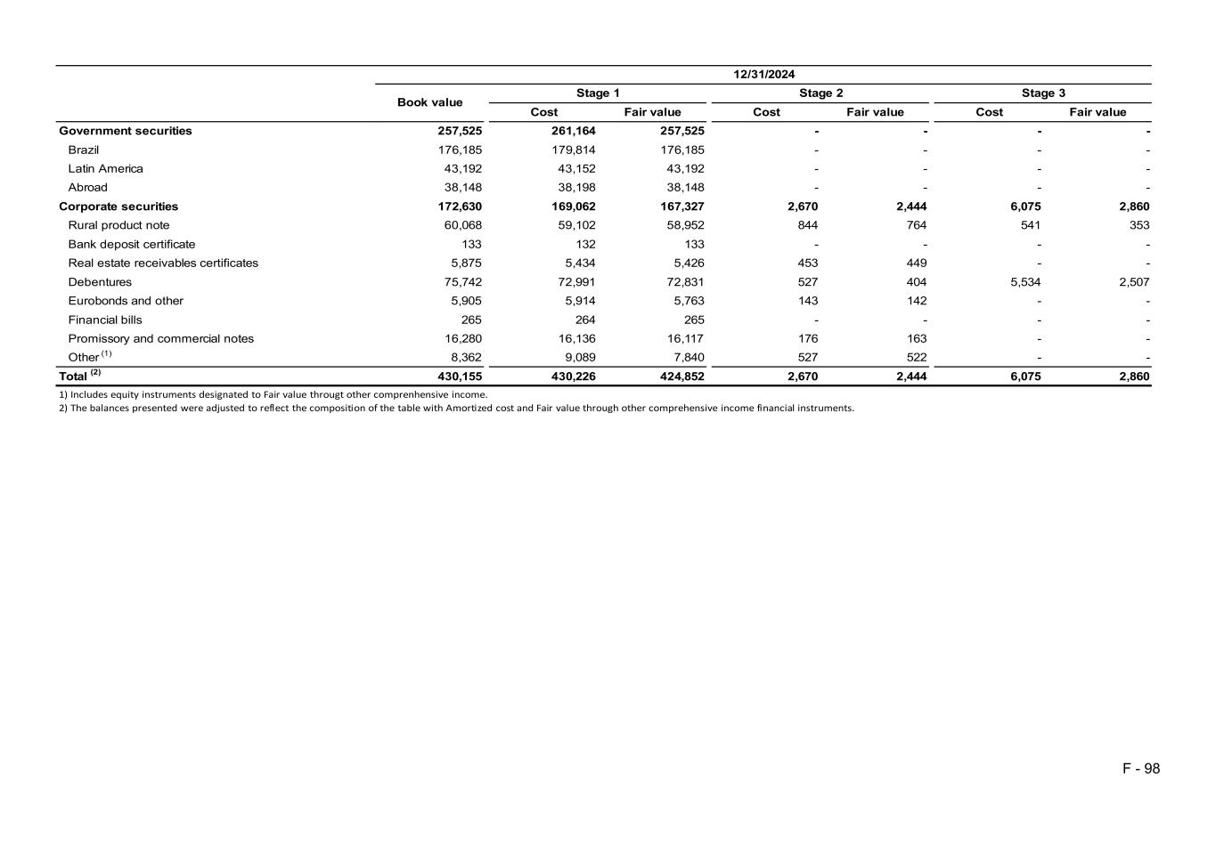 F - 98 12/31/2024 Book value Stage 1 Stage 2 Stage 3 Cost Fair value Cost Fair value Cost Fair value Government securities 257,525 261,164 257,525 - - - - Brazil 176,185 179,814 176,185 - - - - Latin America 43,192 43,152 43,192 - - - - Abroad 38,148 38,198 38,148 - - - - Corporate securities 172,630 169,062 167,327 2,670 2,444 6,075 2,860 Rural product note 60,068 59,102 58,952 844 764 541 353 Bank deposit certificate 133 132 133 - - - - Real estate receivables certificates 5,875 5,434 5,426 453 449 - - Debentures 75,742 72,991 72,831 527 404 5,534 2,507 Eurobonds and other 5,905 5,914 5,763 143 142 - - Financial bills 265 264 265 - - - - Promissory and commercial notes 16,280 16,136 16,117 176 163 - - Other (1) 8,362 9,089 7,840 527 522 - - Total (2) 430,155 430,226 424,852 2,670 2,444 6,075 2,860 1) Includes equity instruments designated to Fair value througt other comprenhensive income. 2) The balances presented were adjusted to reflect the composition of the table with Amortized cost and Fair value through other comprehensive income financial instruments.