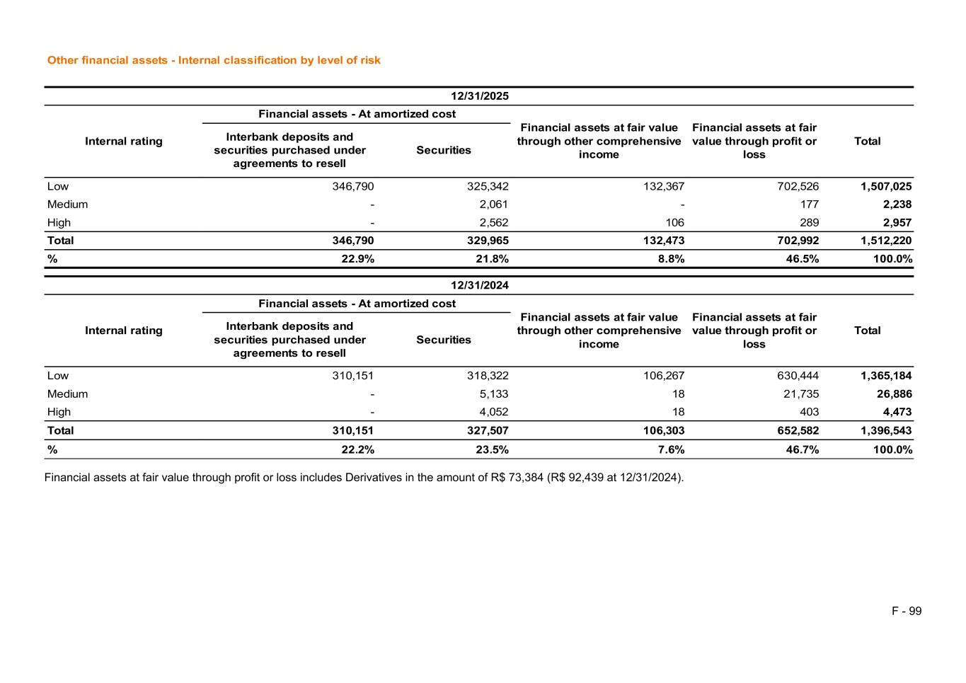 F - 99 Other financial assets - Internal classification by level of risk 12/31/2025 Internal rating Financial assets - At amortized cost Financial assets at fair value through other comprehensive income Financial assets at fair value through profit or loss TotalInterbank deposits and securities purchased under agreements to resell Securities Low 346,790 325,342 132,367 702,526 1,507,025 Medium - 2,061 - 177 2,238 High - 2,562 106 289 2,957 Total 346,790 329,965 132,473 702,992 1,512,220 % 22.9% 21.8% 8.8% 46.5% 100.0% 12/31/2024 Internal rating Financial assets - At amortized cost Financial assets at fair value through other comprehensive income Financial assets at fair value through profit or loss TotalInterbank deposits and securities purchased under agreements to resell Securities Low 310,151 318,322 106,267 630,444 1,365,184 Medium - 5,133 18 21,735 26,886 High - 4,052 18 403 4,473 Total 310,151 327,507 106,303 652,582 1,396,543 % 22.2% 23.5% 7.6% 46.7% 100.0% Financial assets at fair value through profit or loss includes Derivatives in the amount of R$ 73,384 (R$ 92,439 at 12/31/2024).