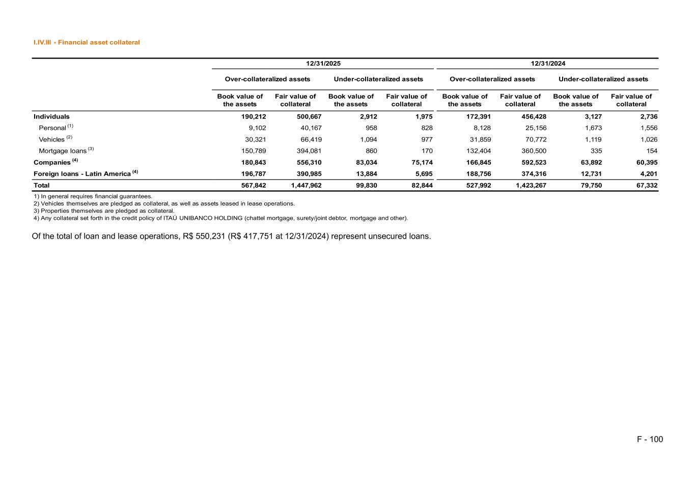 F - 100 I.IV.III - Financial asset collateral 12/31/2025 12/31/2024 Over-collateralized assets Under-collateralized assets Over-collateralized assets Under-collateralized assets Book value of the assets Fair value of collateral Book value of the assets Fair value of collateral Book value of the assets Fair value of collateral Book value of the assets Fair value of collateral Individuals 190,212 500,667 2,912 1,975 172,391 456,428 3,127 2,736 Personal (1) 9,102 40,167 958 828 8,128 25,156 1,673 1,556 Vehicles (2) 30,321 66,419 1,094 977 31,859 70,772 1,119 1,026 Mortgage loans (3) 150,789 394,081 860 170 132,404 360,500 335 154 Companies (4) 180,843 556,310 83,034 75,174 166,845 592,523 63,892 60,395 Foreign loans - Latin America (4) 196,787 390,985 13,884 5,695 188,756 374,316 12,731 4,201 Total 567,842 1,447,962 99,830 82,844 527,992 1,423,267 79,750 67,332 1) In general requires financial guarantees. 2) Vehicles themselves are pledged as collateral, as well as assets leased in lease operations. 3) Properties themselves are pledged as collateral. 4) Any collateral set forth in the credit policy of ITAÚ UNIBANCO HOLDING (chattel mortgage, surety/joint debtor, mortgage and other). Of the total of loan and lease operations, R$ 550,231 (R$ 417,751 at 12/31/2024) represent unsecured loans.