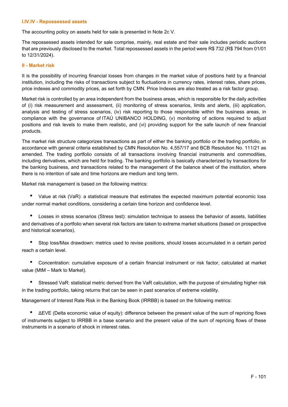 F - 101 I.IV.IV - Repossessed assets The accounting policy on assets held for sale is presented in Note 2c V. The repossessed assets intended for sale comprise, mainly, real estate and their sale includes periodic auctions that are previously disclosed to the market. Total repossessed assets in the period were R$ 732 (R$ 794 from 01/01 to 12/31/2024). II - Market risk It is the possibility of incurring financial losses from changes in the market value of positions held by a financial institution, including the risks of transactions subject to fluctuations in currency rates, interest rates, share prices, price indexes and commodity prices, as set forth by CMN. Price Indexes are also treated as a risk factor group. Market risk is controlled by an area independent from the business areas, which is responsible for the daily activities of (i) risk measurement and assessment, (ii) monitoring of stress scenarios, limits and alerts, (iii) application, analysis and testing of stress scenarios, (iv) risk reporting to those responsible within the business areas, in compliance with the governance of ITAÚ UNIBANCO HOLDING, (v) monitoring of actions required to adjust positions and risk levels to make them realistic, and (vi) providing support for the safe launch of new financial products. The market risk structure categorizes transactions as part of either the banking portfolio or the trading portfolio, in accordance with general criteria established by CMN Resolution No. 4,557/17 and BCB Resolution No. 111/21 as amended. The trading portfolio consists of all transactions involving financial instruments and commodities, including derivatives, which are held for trading. The banking portfolio is basically characterized by transactions for the banking business, and transactions related to the management of the balance sheet of the institution, where there is no intention of sale and time horizons are medium and long term. Market risk management is based on the following metrics: • Value at risk (VaR): a statistical measure that estimates the expected maximum potential economic loss under normal market conditions, considering a certain time horizon and confidence level. • Losses in stress scenarios (Stress test): simulation technique to assess the behavior of assets, liabilities and derivatives of a portfolio when several risk factors are taken to extreme market situations (based on prospective and historical scenarios). • Stop loss/Max drawdown: metrics used to revise positions, should losses accumulated in a certain period reach a certain level. • Concentration: cumulative exposure of a certain financial instrument or risk factor, calculated at market value (MtM – Mark to Market). • Stressed VaR: statistical metric derived from the VaR calculation, with the purpose of simulating higher risk in the trading portfolio, taking returns that can be seen in past scenarios of extreme volatility. Management of Interest Rate Risk in the Banking Book (IRRBB) is based on the following metrics: • ΔEVE (Delta economic value of equity): difference between the present value of the sum of repricing flows of instruments subject to IRRBB in a base scenario and the present value of the sum of repricing flows of these instruments in a scenario of shock in interest rates.