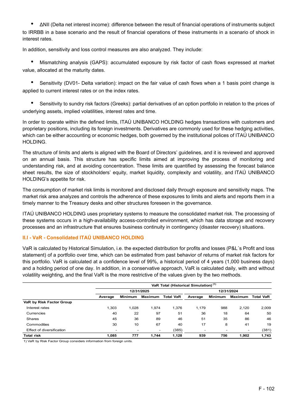 F - 102 • ΔNII (Delta net interest income): difference between the result of financial operations of instruments subject to IRRBB in a base scenario and the result of financial operations of these instruments in a scenario of shock in interest rates. In addition, sensitivity and loss control measures are also analyzed. They include: • Mismatching analysis (GAPS): accumulated exposure by risk factor of cash flows expressed at market value, allocated at the maturity dates. • Sensitivity (DV01- Delta variation): impact on the fair value of cash flows when a 1 basis point change is applied to current interest rates or on the index rates. • Sensitivity to sundry risk factors (Greeks): partial derivatives of an option portfolio in relation to the prices of underlying assets, implied volatilities, interest rates and time. In order to operate within the defined limits, ITAÚ UNIBANCO HOLDING hedges transactions with customers and proprietary positions, including its foreign investments. Derivatives are commonly used for these hedging activities, which can be either accounting or economic hedges, both governed by the institutional polices of ITAÚ UNIBANCO HOLDING. The structure of limits and alerts is aligned with the Board of Directors’ guidelines, and it is reviewed and approved on an annual basis. This structure has specific limits aimed at improving the process of monitoring and understanding risk, and at avoiding concentration. These limits are quantified by assessing the forecast balance sheet results, the size of stockholders’ equity, market liquidity, complexity and volatility, and ITAÚ UNIBANCO HOLDING’s appetite for risk. The consumption of market risk limits is monitored and disclosed daily through exposure and sensitivity maps. The market risk area analyzes and controls the adherence of these exposures to limits and alerts and reports them in a timely manner to the Treasury desks and other structures foreseen in the governance. ITAÚ UNIBANCO HOLDING uses proprietary systems to measure the consolidated market risk. The processing of these systems occurs in a high-availability access-controlled environment, which has data storage and recovery processes and an infrastructure that ensures business continuity in contingency (disaster recovery) situations. II.I - VaR - Consolidated ITAÚ UNIBANCO HOLDING VaR is calculated by Historical Simulation, i.e. the expected distribution for profits and losses (P&L´s Profit and loss statement) of a portfolio over time, which can be estimated from past behavior of returns of market risk factors for this portfolio. VaR is calculated at a confidence level of 99%, a historical period of 4 years (1,000 business days) and a holding period of one day. In addition, in a conservative approach, VaR is calculated daily, with and without volatility weighting, and the final VaR is the more restrictive of the values given by the two methods. VaR Total (Historical Simulation) (1) 12/31/2025 12/31/2024 Average Minimum Maximum Total VaR Average Minimum Maximum Total VaR VaR by Risk Factor Group Interest rates 1,303 1,028 1,974 1,376 1,179 988 2,120 2,009 Currencies 40 22 97 51 36 18 64 50 Shares 45 36 89 46 51 35 86 46 Commodities 30 10 67 40 17 8 41 19 Effect of diversification - - - (385) - - - (381) Total risk 1,085 777 1,744 1,128 939 756 1,902 1,743 1) VaR by Risk Factor Group considers information from foreign units.