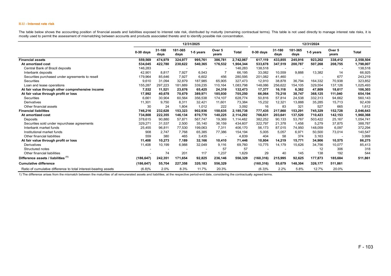 F - 103 II.I.I - Interest rate risk The table below shows the accounting position of financial assets and liabilities exposed to interest rate risk, distributed by maturity (remaining contractual terms). This table is not used directly to manage interest rate risks, it is mostly used to permit the assessment of mismatching between accounts and products associated thereto and to identify possible risk concentration. 12/31/2025 12/31/2024 0-30 days 31-180 days 181-365 days 1-5 years Over 5 years Total 0-30 days 31-180 days 181-365 days 1-5 years Over 5 years Total Financial assets 559,569 474,979 324,977 995,761 386,781 2,742,067 617,119 433,855 245,916 923,202 338,412 2,558,504 At amortized cost 534,045 422,780 230,622 540,365 176,532 1,904,344 533,678 347,519 200,787 507,268 208,755 1,798,007 Central Bank of Brazil deposits 146,283 - - - - 146,283 138,518 - - - - 138,518 Interbank deposits 42,901 8,817 7,927 6,543 7 66,195 33,082 10,559 9,888 13,382 14 66,925 Securities purchased under agreements to resell 179,964 85,646 7,927 6,602 456 280,595 201,082 41,460 - - 677 243,219 Securities 9,610 31,094 32,879 187,985 65,905 327,473 12,910 38,878 36,794 164,332 70,938 323,852 Loan and lease operations 155,287 297,223 181,889 339,235 110,164 1,083,798 148,086 256,622 154,105 329,554 137,126 1,025,493 At fair value through other comprehensive income 7,532 11,521 23,676 65,425 24,319 132,473 17,377 16,118 6,382 47,809 18,617 106,303 At fair value through profit or loss 17,992 40,678 70,679 389,971 185,930 705,250 66,064 70,218 38,747 368,125 111,040 654,194 Securities 6,661 30,904 60,564 356,538 174,107 628,774 50,816 57,814 24,538 332,313 94,662 560,143 Derivatives 11,301 9,750 8,311 32,421 11,601 73,384 15,232 12,321 13,888 35,285 15,713 92,439 Other financial assets 30 24 1,804 1,012 222 3,092 16 83 321 527 665 1,612 Financial liabilities 746,216 232,628 153,323 902,936 150,635 2,185,738 777,435 217,860 153,291 745,329 152,728 2,046,643 At amortized cost 734,808 222,355 146,134 870,770 140,225 2,114,292 766,631 203,641 137,520 710,423 142,153 1,960,368 Deposits 378,615 90,880 57,871 567,747 19,369 1,114,482 382,252 90,133 53,767 503,422 25,167 1,054,741 Securities sold under repurchase agreements 329,271 31,537 2,500 35,140 36,159 434,607 322,797 21,378 1,458 5,279 37,875 388,787 Interbank market funds 25,455 96,811 77,530 199,063 7,311 406,170 56,173 87,015 74,950 148,059 6,097 372,294 Institutional market funds 908 2,747 7,768 65,385 77,386 154,194 5,005 5,057 6,971 50,500 73,014 140,547 Other financial liabilities 559 380 465 3,435 - 4,839 404 58 374 3,163 - 3,999 At fair value through profit or loss 11,408 10,273 7,189 32,166 10,410 71,446 10,804 14,219 15,771 34,906 10,575 86,275 Derivatives 11,408 10,199 6,988 32,049 9,116 69,760 10,775 14,179 15,626 34,756 10,077 85,413 Structured notes - - - - 57 57 - - - 12 306 318 Other financial liabilities - 74 201 117 1,237 1,629 29 40 145 138 192 544 Difference assets / liabilities (1) (186,647) 242,351 171,654 92,825 236,146 556,329 (160,316) 215,995 92,625 177,873 185,684 511,861 Cumulative difference (186,647) 55,704 227,358 320,183 556,329 (160,316) 55,679 148,304 326,177 511,861 Ratio of cumulative difference to total interest-bearing assets (6.8)% 2.0% 8.3% 11.7% 20.3% (6.3)% 2.2% 5.8% 12.7% 20.0% 1) The difference arises from the mismatch between the maturities of all remunerated assets and liabilities, at the respective period-end date, considering the contractually agreed terms.