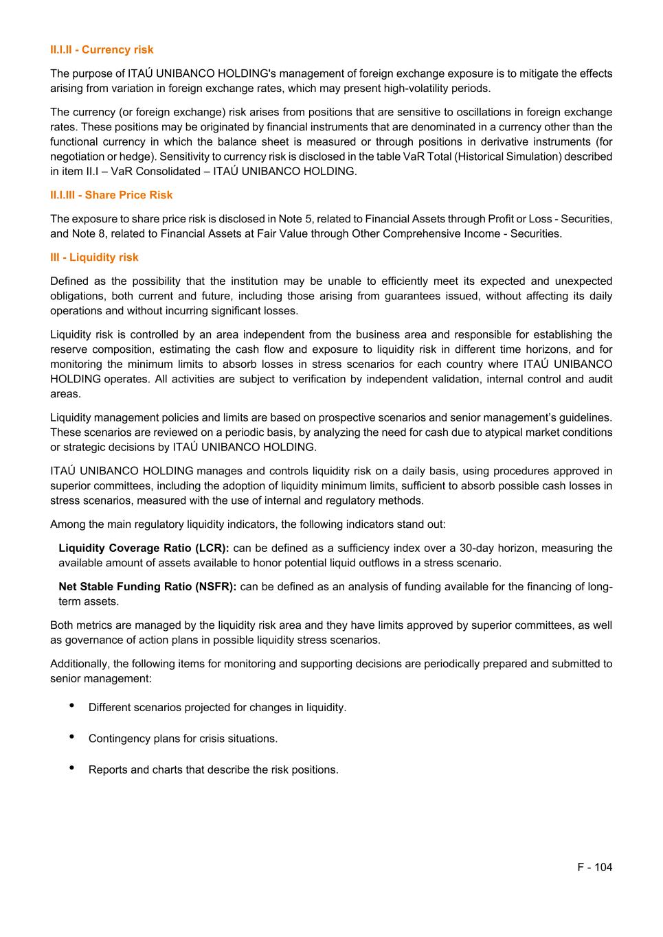 F - 104 II.I.II - Currency risk The purpose of ITAÚ UNIBANCO HOLDING's management of foreign exchange exposure is to mitigate the effects arising from variation in foreign exchange rates, which may present high-volatility periods. The currency (or foreign exchange) risk arises from positions that are sensitive to oscillations in foreign exchange rates. These positions may be originated by financial instruments that are denominated in a currency other than the functional currency in which the balance sheet is measured or through positions in derivative instruments (for negotiation or hedge). Sensitivity to currency risk is disclosed in the table VaR Total (Historical Simulation) described in item II.I – VaR Consolidated – ITAÚ UNIBANCO HOLDING. II.I.III - Share Price Risk The exposure to share price risk is disclosed in Note 5, related to Financial Assets through Profit or Loss - Securities, and Note 8, related to Financial Assets at Fair Value through Other Comprehensive Income - Securities. III - Liquidity risk Defined as the possibility that the institution may be unable to efficiently meet its expected and unexpected obligations, both current and future, including those arising from guarantees issued, without affecting its daily operations and without incurring significant losses. Liquidity risk is controlled by an area independent from the business area and responsible for establishing the reserve composition, estimating the cash flow and exposure to liquidity risk in different time horizons, and for monitoring the minimum limits to absorb losses in stress scenarios for each country where ITAÚ UNIBANCO HOLDING operates. All activities are subject to verification by independent validation, internal control and audit areas. Liquidity management policies and limits are based on prospective scenarios and senior management’s guidelines. These scenarios are reviewed on a periodic basis, by analyzing the need for cash due to atypical market conditions or strategic decisions by ITAÚ UNIBANCO HOLDING. ITAÚ UNIBANCO HOLDING manages and controls liquidity risk on a daily basis, using procedures approved in superior committees, including the adoption of liquidity minimum limits, sufficient to absorb possible cash losses in stress scenarios, measured with the use of internal and regulatory methods. Among the main regulatory liquidity indicators, the following indicators stand out: Liquidity Coverage Ratio (LCR): can be defined as a sufficiency index over a 30-day horizon, measuring the available amount of assets available to honor potential liquid outflows in a stress scenario. Net Stable Funding Ratio (NSFR): can be defined as an analysis of funding available for the financing of long- term assets. Both metrics are managed by the liquidity risk area and they have limits approved by superior committees, as well as governance of action plans in possible liquidity stress scenarios. Additionally, the following items for monitoring and supporting decisions are periodically prepared and submitted to senior management: • Different scenarios projected for changes in liquidity. • Contingency plans for crisis situations. • Reports and charts that describe the risk positions.