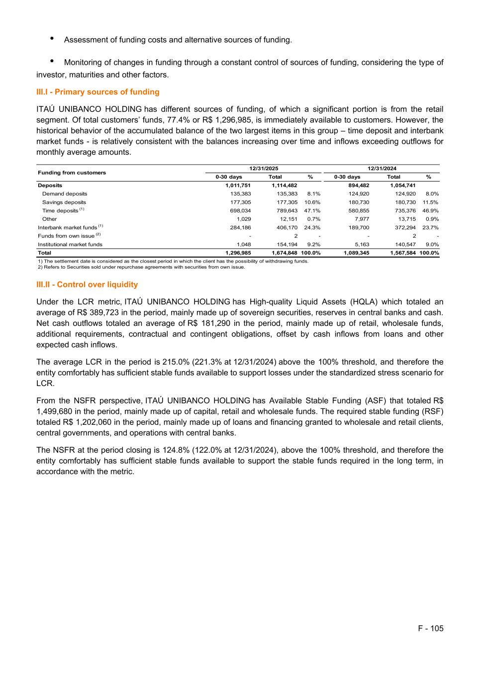 F - 105 • Assessment of funding costs and alternative sources of funding. • Monitoring of changes in funding through a constant control of sources of funding, considering the type of investor, maturities and other factors. III.I - Primary sources of funding ITAÚ UNIBANCO HOLDING has different sources of funding, of which a significant portion is from the retail segment. Of total customers’ funds, 77.4% or R$ 1,296,985, is immediately available to customers. However, the historical behavior of the accumulated balance of the two largest items in this group – time deposit and interbank market funds - is relatively consistent with the balances increasing over time and inflows exceeding outflows for monthly average amounts. Funding from customers 12/31/2025 12/31/2024 0-30 days Total % 0-30 days Total % Deposits 1,011,751 1,114,482 894,482 1,054,741 Demand deposits 135,383 135,383 8.1% 124,920 124,920 8.0% Savings deposits 177,305 177,305 10.6% 180,730 180,730 11.5% Time deposits (1) 698,034 789,643 47.1% 580,855 735,376 46.9% Other 1,029 12,151 0.7% 7,977 13,715 0.9% Interbank market funds (1) 284,186 406,170 24.3% 189,700 372,294 23.7% Funds from own issue (2) - 2 - - 2 - Institutional market funds 1,048 154,194 9.2% 5,163 140,547 9.0% Total 1,296,985 1,674,848 100.0% 1,089,345 1,567,584 100.0% 1) The settlement date is considered as the closest period in which the client has the possibility of withdrawing funds. 2) Refers to Securities sold under repurchase agreements with securities from own issue. III.II - Control over liquidity Under the LCR metric, ITAÚ UNIBANCO HOLDING has High-quality Liquid Assets (HQLA) which totaled an average of R$ 389,723 in the period, mainly made up of sovereign securities, reserves in central banks and cash. Net cash outflows totaled an average of R$ 181,290 in the period, mainly made up of retail, wholesale funds, additional requirements, contractual and contingent obligations, offset by cash inflows from loans and other expected cash inflows. The average LCR in the period is 215.0% (221.3% at 12/31/2024) above the 100% threshold, and therefore the entity comfortably has sufficient stable funds available to support losses under the standardized stress scenario for LCR. From the NSFR perspective, ITAÚ UNIBANCO HOLDING has Available Stable Funding (ASF) that totaled R$ 1,499,680 in the period, mainly made up of capital, retail and wholesale funds. The required stable funding (RSF) totaled R$ 1,202,060 in the period, mainly made up of loans and financing granted to wholesale and retail clients, central governments, and operations with central banks. The NSFR at the period closing is 124.8% (122.0% at 12/31/2024), above the 100% threshold, and therefore the entity comfortably has sufficient stable funds available to support the stable funds required in the long term, in accordance with the metric.