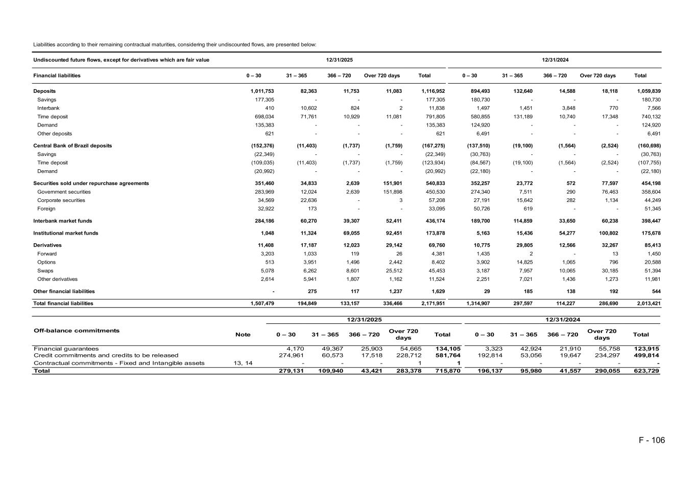 F - 106 Liabilities according to their remaining contractual maturities, considering their undiscounted flows, are presented below: Undiscounted future flows, except for derivatives which are fair value 12/31/2025 12/31/2024 Financial liabilities 0 – 30 31 – 365 366 – 720 Over 720 days Total 0 – 30 31 – 365 366 – 720 Over 720 days Total Deposits 1,011,753 82,363 11,753 11,083 1,116,952 894,493 132,640 14,588 18,118 1,059,839 Savings 177,305 - - - 177,305 180,730 - - - 180,730 Interbank 410 10,602 824 2 11,838 1,497 1,451 3,848 770 7,566 Time deposit 698,034 71,761 10,929 11,081 791,805 580,855 131,189 10,740 17,348 740,132 Demand 135,383 - - - 135,383 124,920 - - - 124,920 Other deposits 621 - - - 621 6,491 - - - 6,491 Central Bank of Brazil deposits (152,376) (11,403) (1,737) (1,759) (167,275) (137,510) (19,100) (1,564) (2,524) (160,698) Savings (22,349) - - - (22,349) (30,763) - - - (30,763) Time deposit (109,035) (11,403) (1,737) (1,759) (123,934) (84,567) (19,100) (1,564) (2,524) (107,755) Demand (20,992) - - - (20,992) (22,180) - - - (22,180) Securities sold under repurchase agreements 351,460 34,833 2,639 151,901 540,833 352,257 23,772 572 77,597 454,198 Government securities 283,969 12,024 2,639 151,898 450,530 274,340 7,511 290 76,463 358,604 Corporate securities 34,569 22,636 - 3 57,208 27,191 15,642 282 1,134 44,249 Foreign 32,922 173 - - 33,095 50,726 619 - - 51,345 Interbank market funds 284,186 60,270 39,307 52,411 436,174 189,700 114,859 33,650 60,238 398,447 Institutional market funds 1,048 11,324 69,055 92,451 173,878 5,163 15,436 54,277 100,802 175,678 Derivatives 11,408 17,187 12,023 29,142 69,760 10,775 29,805 12,566 32,267 85,413 Forward 3,203 1,033 119 26 4,381 1,435 2 - 13 1,450 Options 513 3,951 1,496 2,442 8,402 3,902 14,825 1,065 796 20,588 Swaps 5,078 6,262 8,601 25,512 45,453 3,187 7,957 10,065 30,185 51,394 Other derivatives 2,614 5,941 1,807 1,162 11,524 2,251 7,021 1,436 1,273 11,981 Other financial liabilities - 275 117 1,237 1,629 29 185 138 192 544 Total financial liabilities 1,507,479 194,849 133,157 336,466 2,171,951 1,314,907 297,597 114,227 286,690 2,013,421 Off-balance commitments 12/31/2025 12/31/2024 Note 0 – 30 31 – 365 366 – 720 Over 720 days Total 0 – 30 31 – 365 366 – 720 Over 720 days Total Financial guarantees 4,170 49,367 25,903 54,665 134,105 3,323 42,924 21,910 55,758 123,915 Credit commitments and credits to be released 274,961 60,573 17,518 228,712 581,764 192,814 53,056 19,647 234,297 499,814 Contractual commitments - Fixed and Intangible assets 13, 14 - - - 1 1 - - - - - Total 279,131 109,940 43,421 283,378 715,870 196,137 95,980 41,557 290,055 623,729