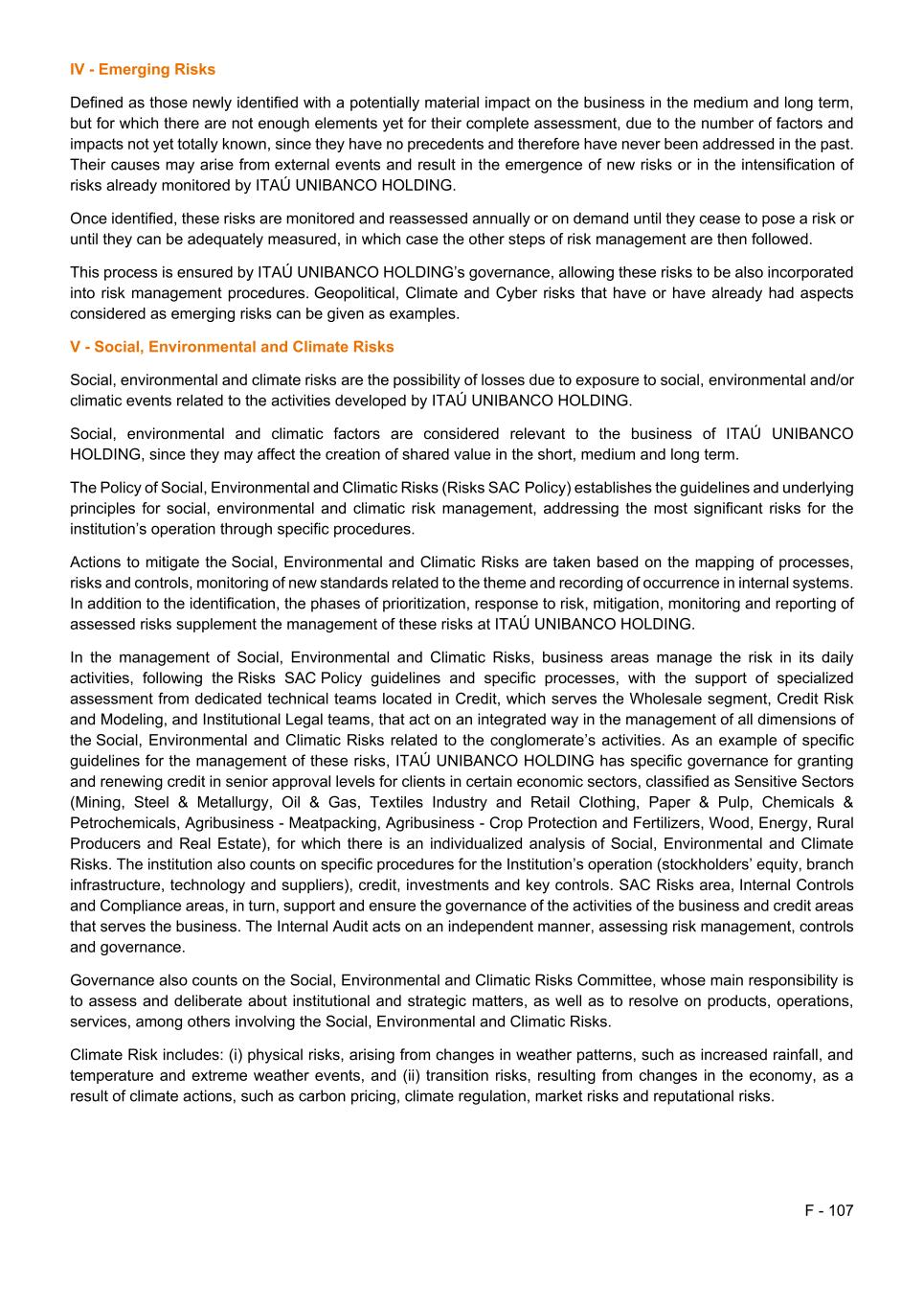 F - 107 IV - Emerging Risks Defined as those newly identified with a potentially material impact on the business in the medium and long term, but for which there are not enough elements yet for their complete assessment, due to the number of factors and impacts not yet totally known, since they have no precedents and therefore have never been addressed in the past. Their causes may arise from external events and result in the emergence of new risks or in the intensification of risks already monitored by ITAÚ UNIBANCO HOLDING. Once identified, these risks are monitored and reassessed annually or on demand until they cease to pose a risk or until they can be adequately measured, in which case the other steps of risk management are then followed. This process is ensured by ITAÚ UNIBANCO HOLDING’s governance, allowing these risks to be also incorporated into risk management procedures. Geopolitical, Climate and Cyber risks that have or have already had aspects considered as emerging risks can be given as examples. V - Social, Environmental and Climate Risks Social, environmental and climate risks are the possibility of losses due to exposure to social, environmental and/or climatic events related to the activities developed by ITAÚ UNIBANCO HOLDING. Social, environmental and climatic factors are considered relevant to the business of ITAÚ UNIBANCO HOLDING, since they may affect the creation of shared value in the short, medium and long term. The Policy of Social, Environmental and Climatic Risks (Risks SAC Policy) establishes the guidelines and underlying principles for social, environmental and climatic risk management, addressing the most significant risks for the institution’s operation through specific procedures. Actions to mitigate the Social, Environmental and Climatic Risks are taken based on the mapping of processes, risks and controls, monitoring of new standards related to the theme and recording of occurrence in internal systems. In addition to the identification, the phases of prioritization, response to risk, mitigation, monitoring and reporting of assessed risks supplement the management of these risks at ITAÚ UNIBANCO HOLDING. In the management of Social, Environmental and Climatic Risks, business areas manage the risk in its daily activities, following the Risks SAC Policy guidelines and specific processes, with the support of specialized assessment from dedicated technical teams located in Credit, which serves the Wholesale segment, Credit Risk and Modeling, and Institutional Legal teams, that act on an integrated way in the management of all dimensions of the Social, Environmental and Climatic Risks related to the conglomerate’s activities. As an example of specific guidelines for the management of these risks, ITAÚ UNIBANCO HOLDING has specific governance for granting and renewing credit in senior approval levels for clients in certain economic sectors, classified as Sensitive Sectors (Mining, Steel & Metallurgy, Oil & Gas, Textiles Industry and Retail Clothing, Paper & Pulp, Chemicals & Petrochemicals, Agribusiness - Meatpacking, Agribusiness - Crop Protection and Fertilizers, Wood, Energy, Rural Producers and Real Estate), for which there is an individualized analysis of Social, Environmental and Climate Risks. The institution also counts on specific procedures for the Institution’s operation (stockholders’ equity, branch infrastructure, technology and suppliers), credit, investments and key controls. SAC Risks area, Internal Controls and Compliance areas, in turn, support and ensure the governance of the activities of the business and credit areas that serves the business. The Internal Audit acts on an independent manner, assessing risk management, controls and governance. Governance also counts on the Social, Environmental and Climatic Risks Committee, whose main responsibility is to assess and deliberate about institutional and strategic matters, as well as to resolve on products, operations, services, among others involving the Social, Environmental and Climatic Risks. Climate Risk includes: (i) physical risks, arising from changes in weather patterns, such as increased rainfall, and temperature and extreme weather events, and (ii) transition risks, resulting from changes in the economy, as a result of climate actions, such as carbon pricing, climate regulation, market risks and reputational risks.