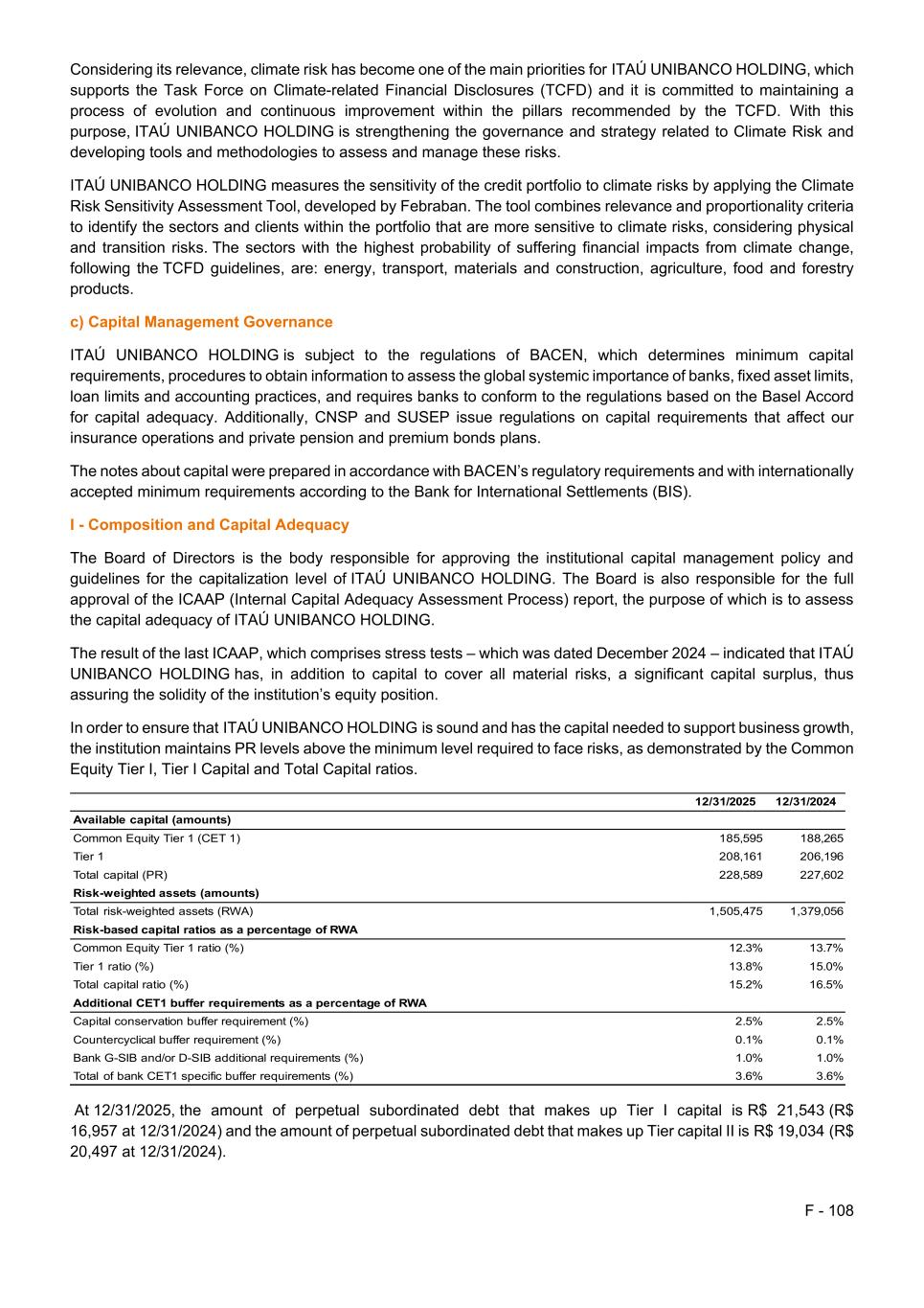 F - 108 Considering its relevance, climate risk has become one of the main priorities for ITAÚ UNIBANCO HOLDING, which supports the Task Force on Climate-related Financial Disclosures (TCFD) and it is committed to maintaining a process of evolution and continuous improvement within the pillars recommended by the TCFD. With this purpose, ITAÚ UNIBANCO HOLDING is strengthening the governance and strategy related to Climate Risk and developing tools and methodologies to assess and manage these risks. ITAÚ UNIBANCO HOLDING measures the sensitivity of the credit portfolio to climate risks by applying the Climate Risk Sensitivity Assessment Tool, developed by Febraban. The tool combines relevance and proportionality criteria to identify the sectors and clients within the portfolio that are more sensitive to climate risks, considering physical and transition risks. The sectors with the highest probability of suffering financial impacts from climate change, following the TCFD guidelines, are: energy, transport, materials and construction, agriculture, food and forestry products. c) Capital Management Governance ITAÚ UNIBANCO HOLDING is subject to the regulations of BACEN, which determines minimum capital requirements, procedures to obtain information to assess the global systemic importance of banks, fixed asset limits, loan limits and accounting practices, and requires banks to conform to the regulations based on the Basel Accord for capital adequacy. Additionally, CNSP and SUSEP issue regulations on capital requirements that affect our insurance operations and private pension and premium bonds plans. The notes about capital were prepared in accordance with BACEN’s regulatory requirements and with internationally accepted minimum requirements according to the Bank for International Settlements (BIS). I - Composition and Capital Adequacy The Board of Directors is the body responsible for approving the institutional capital management policy and guidelines for the capitalization level of ITAÚ UNIBANCO HOLDING. The Board is also responsible for the full approval of the ICAAP (Internal Capital Adequacy Assessment Process) report, the purpose of which is to assess the capital adequacy of ITAÚ UNIBANCO HOLDING. The result of the last ICAAP, which comprises stress tests – which was dated December 2024 – indicated that ITAÚ UNIBANCO HOLDING has, in addition to capital to cover all material risks, a significant capital surplus, thus assuring the solidity of the institution’s equity position. In order to ensure that ITAÚ UNIBANCO HOLDING is sound and has the capital needed to support business growth, the institution maintains PR levels above the minimum level required to face risks, as demonstrated by the Common Equity Tier I, Tier I Capital and Total Capital ratios. 12/31/2025 12/31/2024 Available capital (amounts) Common Equity Tier 1 (CET 1) 185,595 188,265 Tier 1 208,161 206,196 Total capital (PR) 228,589 227,602 Risk-weighted assets (amounts) Total risk-weighted assets (RWA) 1,505,475 1,379,056 Risk-based capital ratios as a percentage of RWA Common Equity Tier 1 ratio (%) 12.3% 13.7% Tier 1 ratio (%) 13.8% 15.0% Total capital ratio (%) 15.2% 16.5% Additional CET1 buffer requirements as a percentage of RWA Capital conservation buffer requirement (%) 2.5% 2.5% Countercyclical buffer requirement (%) 0.1% 0.1% Bank G-SIB and/or D-SIB additional requirements (%) 1.0% 1.0% Total of bank CET1 specific buffer requirements (%) 3.6% 3.6% At 12/31/2025, the amount of perpetual subordinated debt that makes up Tier I capital is R$ 21,543 (R$ 16,957 at 12/31/2024) and the amount of perpetual subordinated debt that makes up Tier capital II is R$ 19,034 (R$ 20,497 at 12/31/2024).