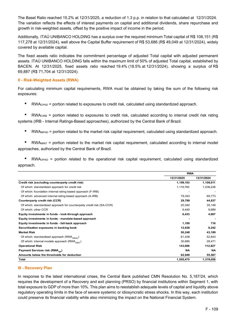 F - 109 The Basel Ratio reached 15.2% at 12/31/2025, a reduction of 1.3 p.p. in relation to that calculated at 12/31/2024. The variation reflects the effects of interest payments on capital and additional dividends, share repurchase and growth in risk-weighted assets, offset by the positive impact of income in the period. Additionally, ITAÚ UNIBANCO HOLDING has a surplus over the required minimum Total capital of R$ 108,151 (R$ 117,278 at 12/31/2024), well above the Capital Buffer requirement of R$ 53,686 (R$ 49,049 at 12/31/2024), widely covered by available capital. The fixed assets ratio indicates the commitment percentage of adjusted Total capital with adjusted permanent assets. ITAÚ UNIBANCO HOLDING falls within the maximum limit of 50% of adjusted Total capital, established by BACEN. At 12/31/2025, fixed assets ratio reached 19.4% (18.5% at 12/31/2024), showing a surplus of R$ 69,887 (R$ 71,704 at 12/31/2024). II - Risk-Weighted Assets (RWA) For calculating minimum capital requirements, RWA must be obtained by taking the sum of the following risk exposures: • RWACPAD = portion related to exposures to credit risk, calculated using standardized approach. • RWACIRB = portion related to exposures to credit risk, calculated according to internal credit risk rating systems (IRB - Internal Ratings-Based approaches), authorized by the Central Bank of Brazil. • RWAMPAD = portion related to the market risk capital requirement, calculated using standardized approach. • RWAMINT = portion related to the market risk capital requirement, calculated according to internal model approaches, authorized by the Central Bank of Brazil. • RWAOPAD = portion related to the operational risk capital requirement, calculated using standardized approach. RWA 12/31/2025 12/31/2024 Credit risk (excluding counterparty credit risk) 1,199,103 1,108,011 Of which: standardized approach for credit risk 1,119,760 1,038,238 Of which: foundation internal rating-based approach (F-IRB) - - Of which: advanced internal rating-based approach (A-IRB) 79,343 69,773 Counterparty credit risk (CCR) 29,789 44,837 Of which: standardized approach for counterparty credit risk (SA-CCR) 20,340 35,148 Of which: other CCR 9,449 9,689 Equity investments in funds - look-through approach 6,433 4,667 Equity investments in funds - mandate-based approach - - Equity investments in funds - fall-back approach 1,109 716 Securitization exposures in banking book 12,838 9,242 Market Risk 50,248 43,189 Of which: standardized approach (RWA MPAD ) 61,438 52,643 Of which: internal models approach (RWA MINT ) 30,685 28,471 Operational Risk 143,006 112,827 Payment Services risk (RWA SP ) NA NA Amounts below the thresholds for deduction 62,949 55,567 Total 1,505,475 1,379,056 III - Recovery Plan In response to the latest international crises, the Central Bank published CMN Resolution No. 5,187/24, which requires the development of a Recovery and exit planning (PRSO) by financial institutions within Segment 1, with total exposure to GDP of more than 10%. This plan aims to reestablish adequate levels of capital and liquidity above regulatory operating limits in the face of severe systemic or idiosyncratic stress shocks. In this way, each institution could preserve its financial viability while also minimizing the impact on the National Financial System.