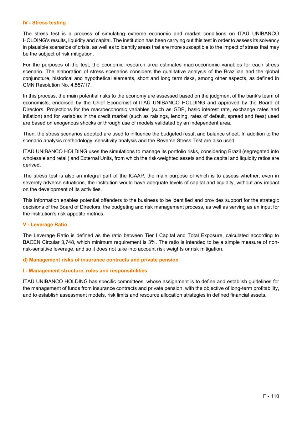 F - 110 IV - Stress testing The stress test is a process of simulating extreme economic and market conditions on ITAÚ UNIBANCO HOLDING’s results, liquidity and capital. The institution has been carrying out this test in order to assess its solvency in plausible scenarios of crisis, as well as to identify areas that are more susceptible to the impact of stress that may be the subject of risk mitigation. For the purposes of the test, the economic research area estimates macroeconomic variables for each stress scenario. The elaboration of stress scenarios considers the qualitative analysis of the Brazilian and the global conjuncture, historical and hypothetical elements, short and long term risks, among other aspects, as defined in CMN Resolution No. 4,557/17. In this process, the main potential risks to the economy are assessed based on the judgment of the bank's team of economists, endorsed by the Chief Economist of ITAÚ UNIBANCO HOLDING and approved by the Board of Directors. Projections for the macroeconomic variables (such as GDP, basic interest rate, exchange rates and inflation) and for variables in the credit market (such as raisings, lending, rates of default, spread and fees) used are based on exogenous shocks or through use of models validated by an independent area. Then, the stress scenarios adopted are used to influence the budgeted result and balance sheet. In addition to the scenario analysis methodology, sensitivity analysis and the Reverse Stress Test are also used. ITAÚ UNIBANCO HOLDING uses the simulations to manage its portfolio risks, considering Brazil (segregated into wholesale and retail) and External Units, from which the risk-weighted assets and the capital and liquidity ratios are derived. The stress test is also an integral part of the ICAAP, the main purpose of which is to assess whether, even in severely adverse situations, the institution would have adequate levels of capital and liquidity, without any impact on the development of its activities. This information enables potential offenders to the business to be identified and provides support for the strategic decisions of the Board of Directors, the budgeting and risk management process, as well as serving as an input for the institution’s risk appetite metrics. V - Leverage Ratio The Leverage Ratio is defined as the ratio between Tier I Capital and Total Exposure, calculated according to BACEN Circular 3,748, which minimum requirement is 3%. The ratio is intended to be a simple measure of non- risk-sensitive leverage, and so it does not take into account risk weights or risk mitigation. d) Management risks of insurance contracts and private pension I - Management structure, roles and responsibilities ITAÚ UNIBANCO HOLDING has specific committees, whose assignment is to define and establish guidelines for the management of funds from insurance contracts and private pension, with the objective of long-term profitability, and to establish assessment models, risk limits and resource allocation strategies in defined financial assets.