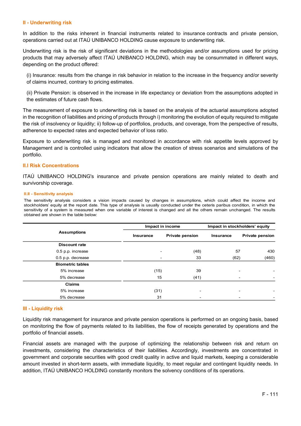 F - 111 II - Underwriting risk In addition to the risks inherent in financial instruments related to insurance contracts and private pension, operations carried out at ITAÚ UNIBANCO HOLDING cause exposure to underwriting risk. Underwriting risk is the risk of significant deviations in the methodologies and/or assumptions used for pricing products that may adversely affect ITAÚ UNIBANCO HOLDING, which may be consummated in different ways, depending on the product offered: (i) Insurance: results from the change in risk behavior in relation to the increase in the frequency and/or severity of claims incurred, contrary to pricing estimates. (ii) Private Pension: is observed in the increase in life expectancy or deviation from the assumptions adopted in the estimates of future cash flows. The measurement of exposure to underwriting risk is based on the analysis of the actuarial assumptions adopted in the recognition of liabilities and pricing of products through i) monitoring the evolution of equity required to mitigate the risk of insolvency or liquidity; ii) follow-up of portfolios, products, and coverage, from the perspective of results, adherence to expected rates and expected behavior of loss ratio. Exposure to underwriting risk is managed and monitored in accordance with risk appetite levels approved by Management and is controlled using indicators that allow the creation of stress scenarios and simulations of the portfolio. II.I Risk Concentrations ITAÚ UNIBANCO HOLDING's insurance and private pension operations are mainly related to death and survivorship coverage. II.II - Sensitivity analysis The sensitivity analysis considers a vision impacts caused by changes in assumptions, which could affect the income and stockholders’ equity at the report date. This type of analysis is usually conducted under the ceteris paribus condition, in which the sensitivity of a system is measured when one variable of interest is changed and all the others remain unchanged. The results obtained are shown in the table below: Assumptions Impact in income Impact in stockholders’ equity Insurance Private pension Insurance Private pension Discount rate 0.5 p.p. increase - (48) 57 430 0.5 p.p. decrease - 33 (62) (460) Biometric tables 5% increase (15) 39 - - 5% decrease 15 (41) - - Claims 5% increase (31) - - - 5% decrease 31 - - - III - Liquidity risk Liquidity risk management for insurance and private pension operations is performed on an ongoing basis, based on monitoring the flow of payments related to its liabilities, the flow of receipts generated by operations and the portfolio of financial assets. Financial assets are managed with the purpose of optimizing the relationship between risk and return on investments, considering the characteristics of their liabilities. Accordingly, investments are concentrated in government and corporate securities with good credit quality in active and liquid markets, keeping a considerable amount invested in short-term assets, with immediate liquidity, to meet regular and contingent liquidity needs. In addition, ITAÚ UNIBANCO HOLDING constantly monitors the solvency conditions of its operations.