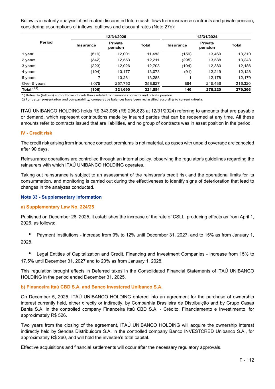 F - 112 Below is a maturity analysis of estimated discounted future cash flows from insurance contracts and private pension, considering assumptions of inflows, outflows and discount rates (Note 27c): Period 12/31/2025 12/31/2024 Insurance Private pension Total Insurance Private pension Total 1 year (519) 12,001 11,482 (159) 13,469 13,310 2 years (342) 12,553 12,211 (295) 13,538 13,243 3 years (223) 12,926 12,703 (194) 12,380 12,186 4 years (104) 13,177 13,073 (91) 12,219 12,128 5 years 7 13,281 13,288 1 12,178 12,179 Over 5 years 1,075 257,752 258,827 884 215,436 216,320 Total (1,2) (106) 321,690 321,584 146 279,220 279,366 1) Refers to (inflows) and outflows of cash flows related to insurance contracts and private pension. 2) For better presentation and comparability, comparative balances have been reclassified according to current criteria. ITAÚ UNIBANCO HOLDING holds R$ 343,066 (R$ 295,823 at 12/31/2024) referring to amounts that are payable or demand, which represent contributions made by insured parties that can be redeemed at any time. All these amounts refer to contracts issued that are liabilities, and no group of contracts was in asset position in the period. IV - Credit risk The credit risk arising from insurance contract premiums is not material, as cases with unpaid coverage are canceled after 90 days. Reinsurance operations are controlled through an internal policy, observing the regulator's guidelines regarding the reinsurers with which ITAÚ UNIBANCO HOLDING operates. Taking out reinsurance is subject to an assessment of the reinsurer's credit risk and the operational limits for its consummation, and monitoring is carried out during the effectiveness to identify signs of deterioration that lead to changes in the analyzes conducted. Note 33 - Supplementary information a) Supplementary Law No. 224/25 Published on December 26, 2025, it establishes the increase of the rate of CSLL, producing effects as from April 1, 2026, as follows: • Payment Institutions - increase from 9% to 12% until December 31, 2027, and to 15% as from January 1, 2028. • Legal Entities of Capitalization and Credit, Financing and Investment Companies - increase from 15% to 17.5% until December 31, 2027 and to 20% as from January 1, 2028. This regulation brought effects in Deferred taxes in the Consolidated Financial Statements of ITAÚ UNIBANCO HOLDING in the period ended December 31, 2025. b) Financeira Itaú CBD S.A. and Banco Investcred Unibanco S.A. On December 5, 2025, ITAÚ UNIBANCO HOLDING entered into an agreement for the purchase of ownership interest currently held, either directly or indirectly, by Companhia Brasileira de Distribuição and by Grupo Casas Bahia S.A. in the controlled company Financeira Itaú CBD S.A. - Crédito, Financiamento e Investimento, for approximately R$ 526. Two years from the closing of the agreement, ITAÚ UNIBANCO HOLDING will acquire the ownership interest indirectly held by Sendas Distribuidora S.A. in the controlled company Banco INVESTCRED Unibanco S.A., for approximately R$ 260, and will hold the investee’s total capital. Effective acquisitions and financial settlements will occur after the necessary regulatory approvals.