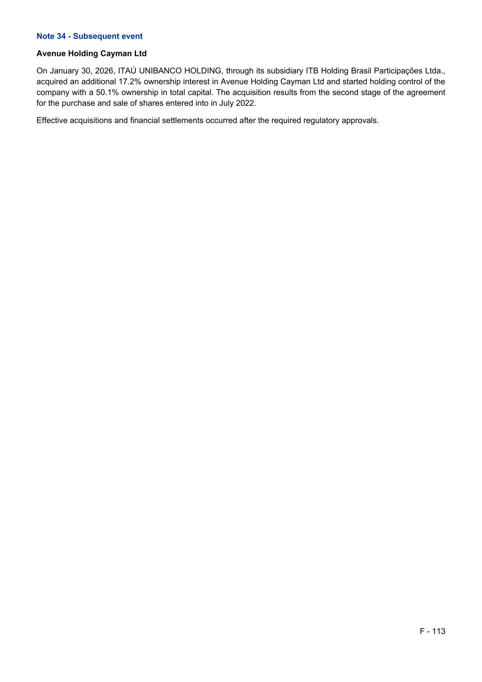 F - 113 Note 34 - Subsequent event Avenue Holding Cayman Ltd On January 30, 2026, ITAÚ UNIBANCO HOLDING, through its subsidiary ITB Holding Brasil Participações Ltda., acquired an additional 17.2% ownership interest in Avenue Holding Cayman Ltd and started holding control of the company with a 50.1% ownership in total capital. The acquisition results from the second stage of the agreement for the purchase and sale of shares entered into in July 2022. Effective acquisitions and financial settlements occurred after the required regulatory approvals.