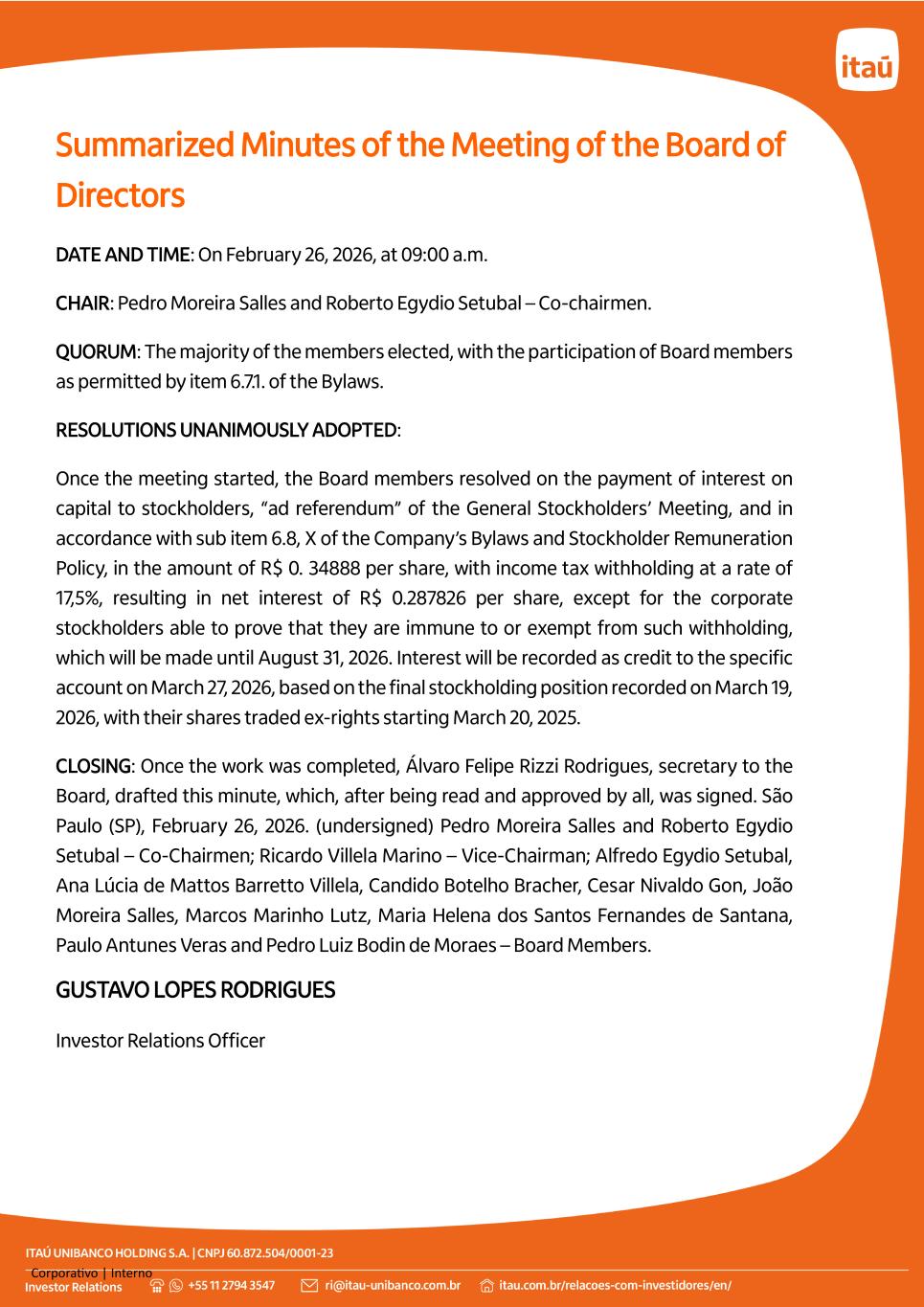 Corporativo | Interno Summarized Minutes of the Meeting of the Board of Directors DATE AND TIME: On February 26, 2026, at 09:00 a.m. CHAIR: Pedro Moreira Salles and Roberto Egydio Setubal – Co-chairmen. QUORUM: The majority of the members elected, with the participation of Board members as permitted by item 6.7.1. of the Bylaws. RESOLUTIONS UNANIMOUSLY ADOPTED: Once the meeting started, the Board members resolved on the payment of interest on capital to stockholders, “ad referendum” of the General Stockholders’ Meeting, and in accordance with sub item 6.8, X of the Company’s Bylaws and Stockholder Remuneration Policy, in the amount of R$ 0. 34888 per share, with income tax withholding at a rate of 17,5%, resulting in net interest of R$ 0.287826 per share, except for the corporate stockholders able to prove that they are immune to or exempt from such withholding, which will be made until August 31, 2026. Interest will be recorded as credit to the specific account on March 27, 2026, based on the final stockholding position recorded on March 19, 2026, with their shares traded ex-rights starting March 20, 2025. CLOSING: Once the work was completed, Álvaro Felipe Rizzi Rodrigues, secretary to the Board, drafted this minute, which, after being read and approved by all, was signed. São Paulo (SP), February 26, 2026. (undersigned) Pedro Moreira Salles and Roberto Egydio Setubal – Co-Chairmen; Ricardo Villela Marino – Vice-Chairman; Alfredo Egydio Setubal, Ana Lúcia de Mattos Barretto Villela, Candido Botelho Bracher, Cesar Nivaldo Gon, João Moreira Salles, Marcos Marinho Lutz, Maria Helena dos Santos Fernandes de Santana, Paulo Antunes Veras and Pedro Luiz Bodin de Moraes – Board Members. GUSTAVO LOPES RODRIGUES Investor Relations Officer