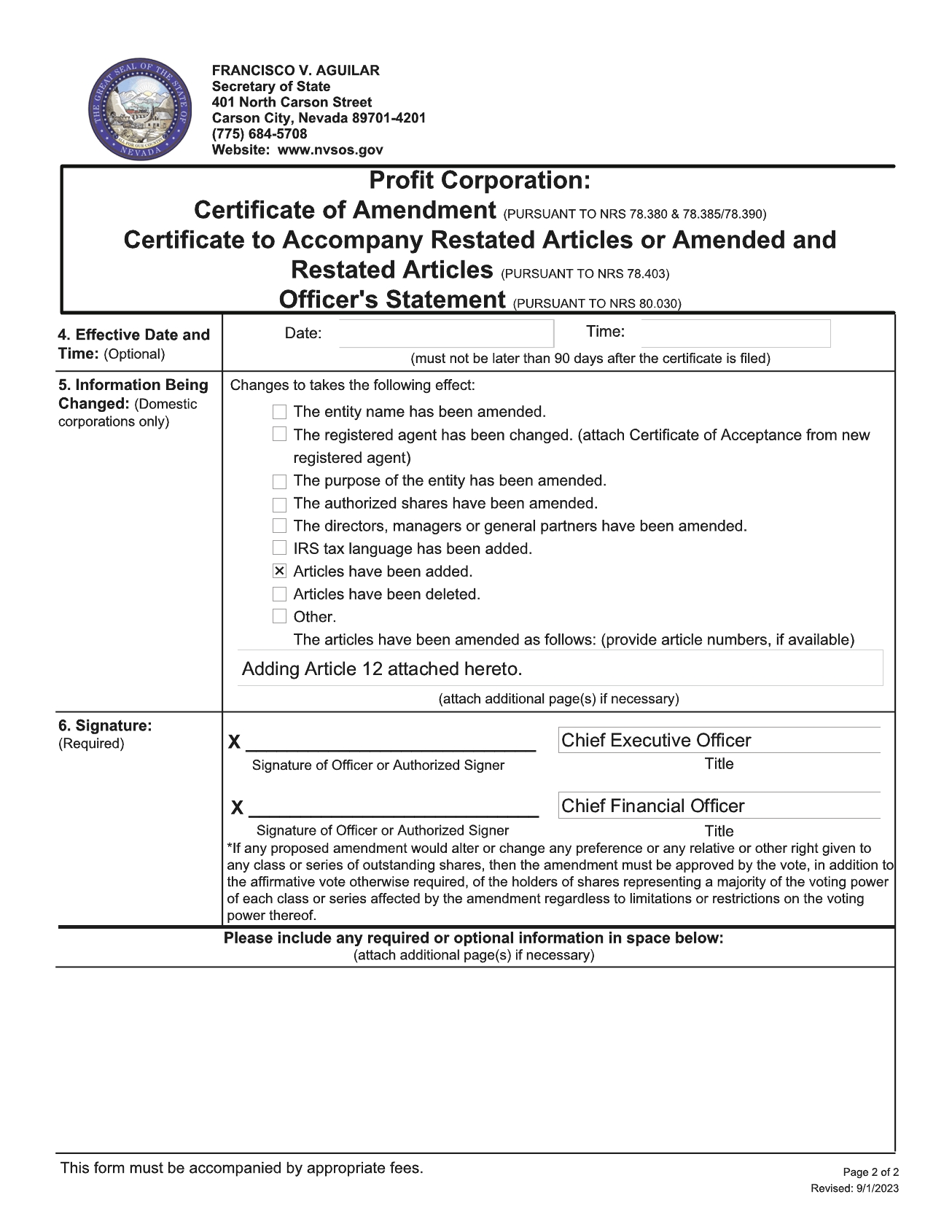 (vi) “Effective Date” means the date the certificate of amendment seeking to add this Article 12 to the Corporation’s Amended and Restated Articles of Incorporation is filed with the Nevada Secretary of State, pursuant to NRS 78.385 and 78.390.