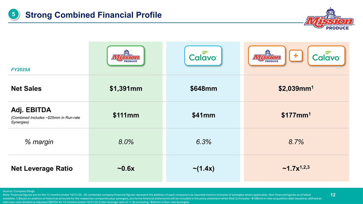 …Creating a Premier North American Avocado & Fresh Produce Platform • Top-tier platform across the Pro Forma Product Mix P avocado value chain, with a + Tomato Other Guacamole leading position in North America 2% 1% 4% Avocado and pathways to expand Mango 84% 4% 1 internationally ~$2bn Blueberry 5% Pro Forma Net Sales • Scaled end-to-end capabilities: P sourcing, packing, ripening, logistics and distribution (vertically integrated model) 1 ~$177mm Pro Forma Geographic Mix o Allows Mission Produce to Pro Forma Adj. EBITDA Rest of (Includes ~$25mm in Run-rate Synergies) enter high-growth, attractive World U.S. 17% 83% guacamole segment • Significant value creation via P 1 ~5,800 actionable cost synergies and proven track record of operational Pro Forma Global Employees excellence Source: Company filings Note: Financial figures are for the 12 months ended 10/31/25. All combined company financial figures represent the addition of each company's as reported metrics inclusive of synergies where applicable. Non-financial figures as of latest available. 4 1) Based on addition of historical amounts for the respective companies plus synergies, pro forma financial statements will be included in the proxy statement when filed
