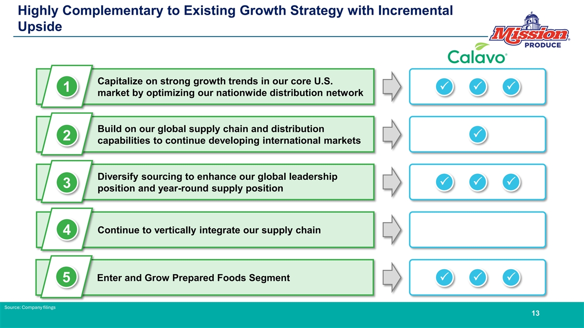 Mission is a leading global supplier of avocados with fully integrated operations, including value-added services such as ripening, packaging, regional distribution, and logistics supported by state-of-the-art infrastructure. The addition of Calavo is expected to create a scaled North American avocado and fresh produce platform well positioned to expand internationally and accelerate Mission’s business model diversification by expanding its presence in the high-growth prepared foods segment following closing. Mission has previously expanded into produce categories including mangos and blueberries, and Calavo’s tomato and papaya offerings further diversify Mission’s produce portfolio. In addition, the combination of both companies’ grower networks positions Mission to enhance supply reliability and sourcing security.