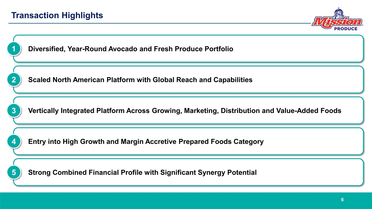 Transaction Overview Transaction • Mission Produce to acquire all of the issued and outstanding shares of common stock of Calavo Growers Overview Merger • 0.9790x of a Mission Produce share per Calavo Growers share • $14.85 of cash per Calavo Growers share Consideration • 55% Cash / 45% Stock Cash / Stock Mix • 19.7% implied Calavo Growers ownership; 80.3% implied Mission Produce ownership • The cash component of the proposed transaction will be wholly funded from amended Mission Produce debt facilities, and is not contingent on any Financing financing requirements Synergies• Estimated ~$25mm of annual cost synergies, with meaningful upside potential • Mission Produce shareholder approval • Calavo Growers shareholder approval Key Closing Conditions• Antitrust clearance • Tax opinion Governance• Calavo Growers to receive 1 board seat on Mission Produce expanded board • 3.5% / $15.02mm of Enterprise Value Reverse Termination Fee Termination Fee • 3.0% / $12.87mm of Enterprise Value Termination Fee Timing• Expected to close by the end of August 2026 5