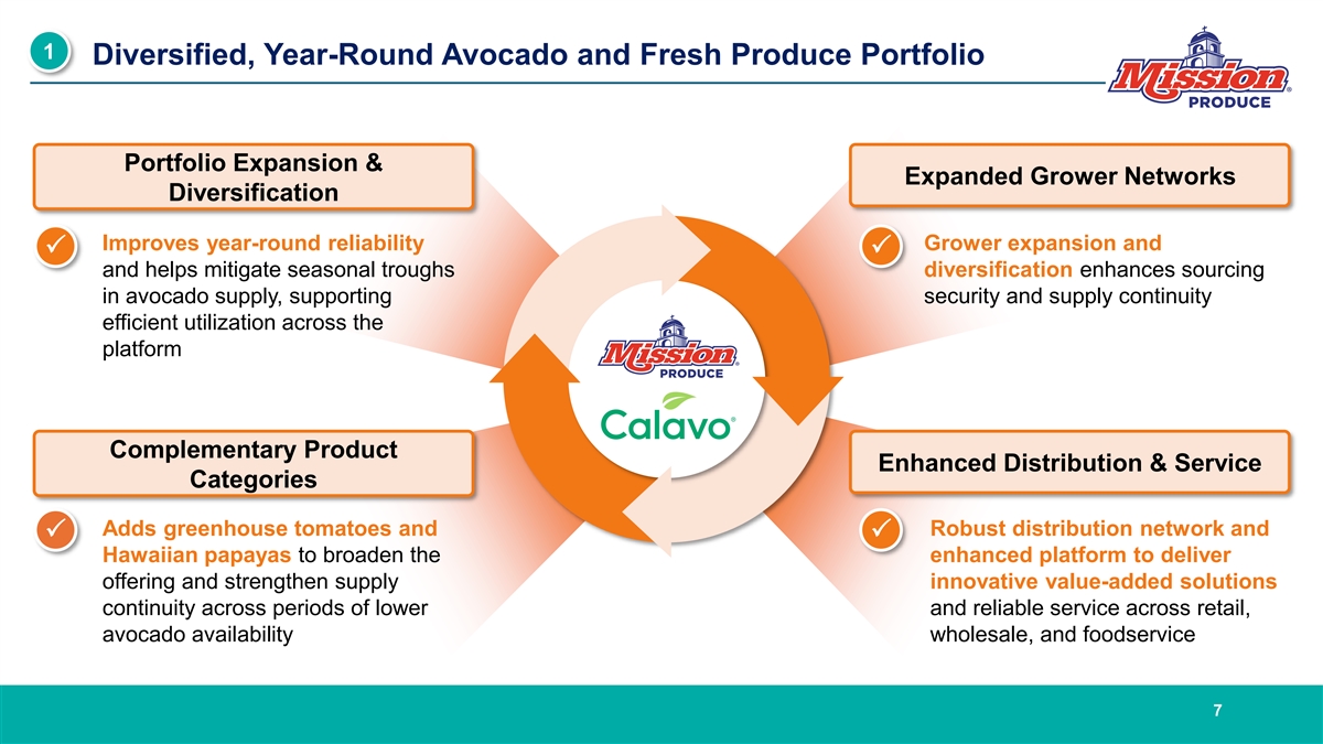 Transaction Highlights Diversified, Year-Round Avocado and Fresh Produce Portfolio 1 Scaled North American Platform with Global Reach and Capabilities 2 Vertically Integrated Platform Across Growing, Marketing, Distribution and Value-Added Foods 3 Entry into High Growth and Margin Accretive Prepared Foods Category 4 Strong Combined Financial Profile with Significant Synergy Potential 5 6