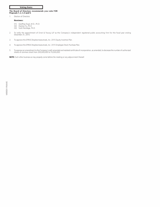 Voting Items The Board of Directors recommends you vote FOR Proposals 1, 2, 3, 4 and 5: 1. Election of Directors Nominees: 01) Geoffrey Duyk, M.D., Ph.D. 02) Daotian Fu, Ph.D. 03) Scott Rocklage, Ph.D. 2. To ratify the appointment of Ernst & Young LLP as the Company's independent registered public accounting firm for the fiscal year ending December 31, 2015. 3. To approve the EPIRUS Biopharmaceuticals, Inc. 2015 Equity Incentive Plan. 4. To approve the EPIRUS Biopharmaceuticals, Inc. 2015 Employee Stock Purchase Plan. 5. To approve an amendment to the Company's sixth amended and restated certificate of incorporation, as amended, to decrease the number of authorized shares of common stock from 300,000,000 to 70,000,000. NOTE: Such other business as may properly come before the meeting or any adjournment thereof. M89591-P64045 |