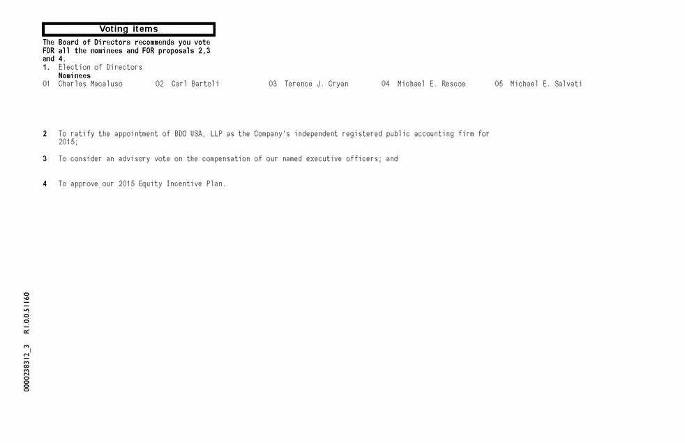 Voting items 0000238312_3 R1.0.0.51160 The Board of Directors recommends you vote FOR all the nominees and FOR proposals 2,3 and 4. 1. Election of Directors Nominees 01 Charles Macaluso 02 Carl Bartoli 03 Terence J. Cryan 04 Michael E. Rescoe 05 Michael E. Salvati 2 To ratify the appointment of BDO USA, LLP as the Company's independent registered public accounting firm for 2015; 3 To consider an advisory vote on the compensation of our named executive officers; and 4 To approve our 2015 Equity Incentive Plan. |