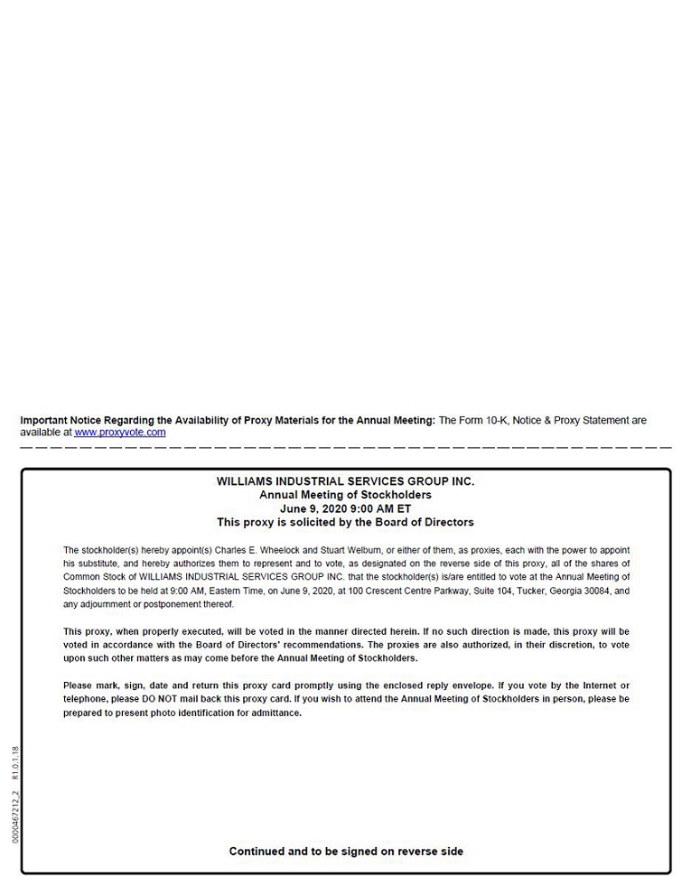 Important Notice Regarding the Availability of Proxy Materials for the Annual Meeting: The Form 10-K, Notice & Proxy Statement are available at www.proxyvote.com WILLIAMS INDUSTRIAL SERVICES GROUP INC. Annual Meeting of Stockholders June 9, 2020 9:00 AM ET This proxy is solicited by the Board of Directors The stockholder(s) hereby appoint(s) Charles E. Wheelock and Stuart Welburn, or either of them, as proxies, each with the power to appoint his substitute, and hereby authorizes them to represent and to vote, as designated on the reverse side of this proxy, all of the shares of Common Stock of WILLIAMS INDUSTRIAL SERVICES GROUP INC. that the stockholder(s) is/are entitled to vote at the Annual Meeting of Stockholders to be held at 9:00 AM, Eastern Time, on June 9, 2020, at 100 Crescent Centre Parkway, Suite 104, Tucker, Georgia 30084, and any adjournment or postponement thereof. This proxy, when properly executed, will be voted in the manner directed herein. If no such direction is made, this proxy will be voted in accordance with the Board of Directors' recommendations. The proxies are also authorized, in their discretion, to vote upon such other matters as may come before the Annual Meeting of Stockholders. Please mark, sign, date and return this proxy card promptly using the enclosed reply envelope. If you vote by the Internet or telephone, please DO NOT mail back this proxy card. If you wish to attend the Annual Meeting of Stockholders in person, please be prepared to present photo identification for admittance. Continued and to be signed on reverse side