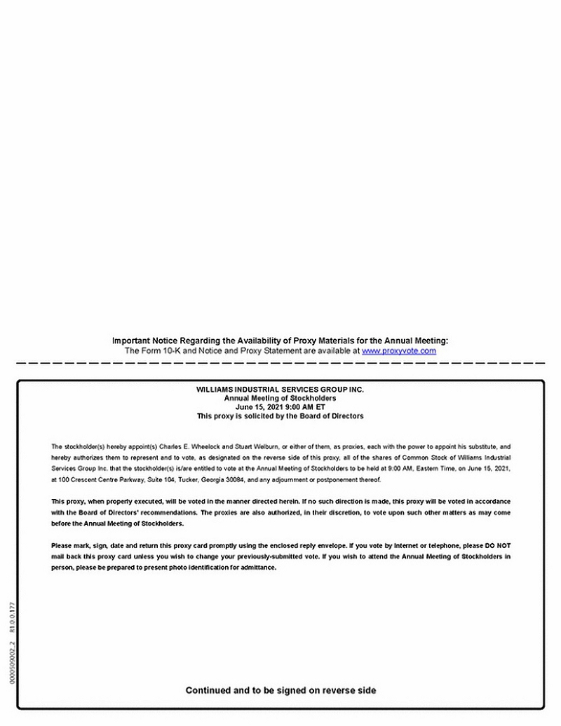 Important Notice Regarding the Availability of Proxy Materials for the Annual Meeting: The Form 10-K and Notice and Proxy Statement are available at www.proxyvote.com WILLIAMS INDUSTRIAL SERVICES GROUP INC. Annual Meeting of Stockholders June 15, 2021 9:00 AM ET This proxy is solicited by the Board of Directors The stockholder(s) hereby appoint(s) Charles E. Wheelock and Stuart Welburn, or either of them, as proxies, each with the power to appoint his substitute, and hereby authorizes them to represent and to vote, as designated on the reverse side of this proxy, all of the shares of Common Stock of Williams Industrial Services Group Inc. that the stockholder(s) is/are entitled to vote at the Annual Meeting of Stockholders to be held at 9:00 AM, Eastern Time, on June 15, 2021, at 100 Crescent Centre Parkway, Suite 104, Tucker, Georgia 30084, and any adjournment or postponement thereof. This proxy, when properly executed, will be voted in the manner directed herein. If no such direction is made, this proxy will be voted in accordance with the Board of Directors' recommendations. The proxies are also authorized, in their discretion, to vote upon such other matters as may come before the Annual Meeting of Stockholders. Please mark, sign, date and return this proxy card promptly using the enclosed reply envelope. If you vote by Internet or telephone, please DO NOT mail back this proxy card unless you wish to change your previously-submitted vote. If you wish to attend the Annual Meeting of Stockholders in person, please be prepared to present photo identification for admittance. Continued and to be signed on reverse side 0000509002_2 R1.0.0.177 |