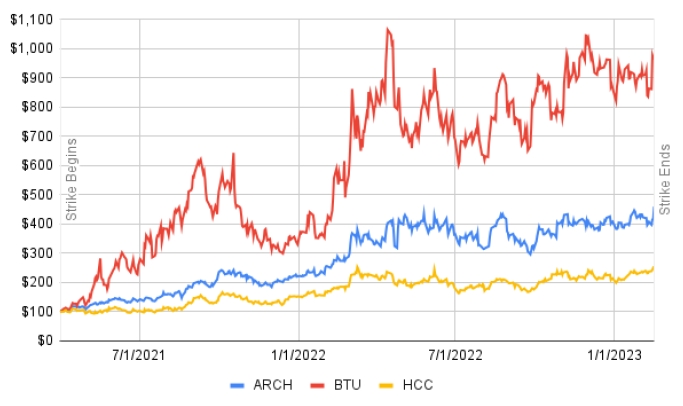 The Company’s stock price also underperformed these direct peers during the UMWA strike. In the Company’s 2022 Annual Report’s Stock Performance Graph, Arch Resources, Inc. and Peabody Energy Corp. were identified as the Company’s Custom Composite Index that reflected publicly listed U.S. companies within the coal industry of similar size and product type.16 We note that the Company has omitted this Custom Composite Index from its 2023 Annual Report’s Stock Performance Graph.17 The following graph shows the cumulative total shareholder return for our Company’s stock (NYSE:HCC) compared to Arch Resources, Inc. (NYSE:ARCH) and Peabody Energy Corporation (NYSE:BTU) from the day before the strike commenced on April 1, 2021 until the strike ended on February 13, 2023. The graph assumes that $100 was invested on March 31, 2021 (the day before the UMWA strike commenced) through February 16, 2023 (the day that the UMWA strike ended) in each company’s common stock and that all dividends were reinvested.