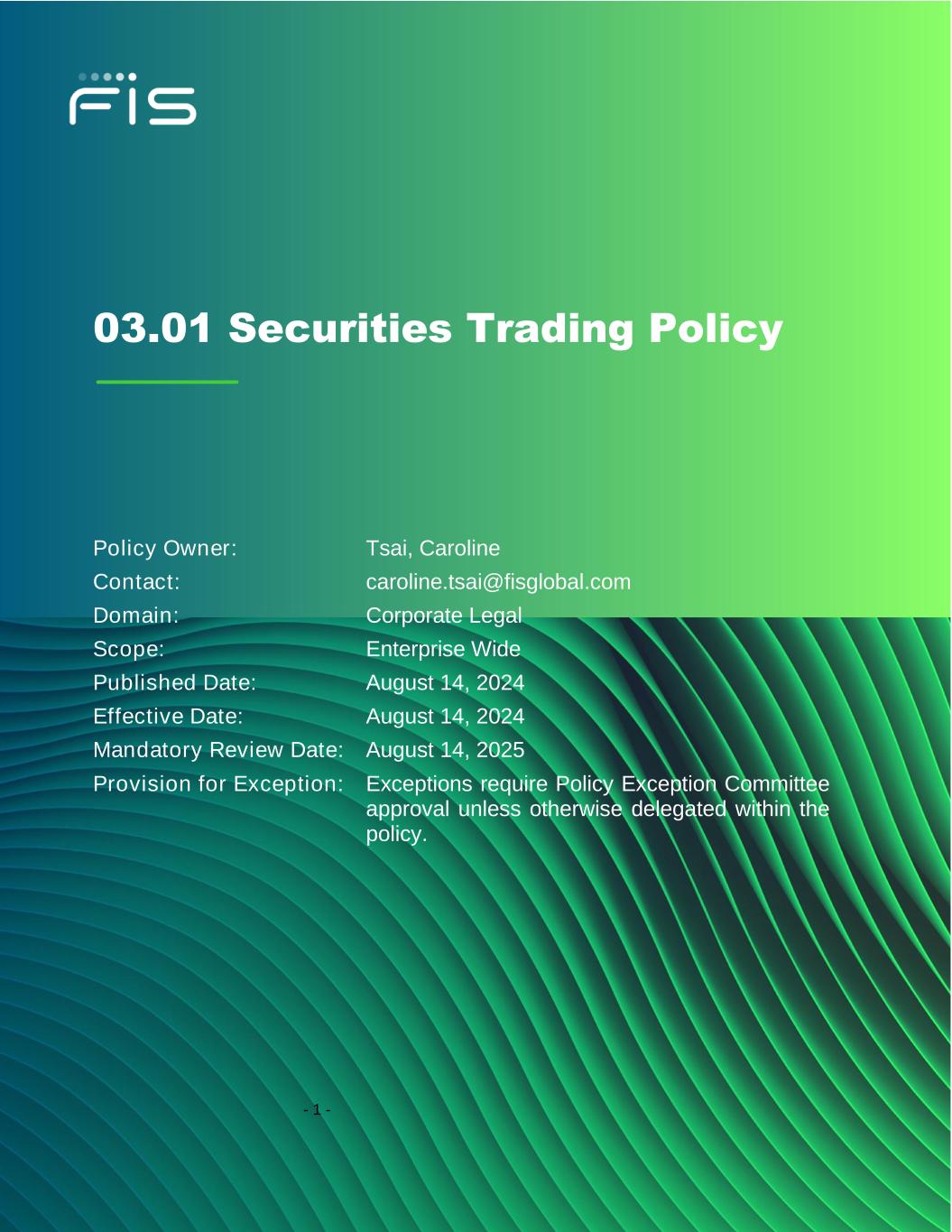 - 1 - 03.01 Securities Trading Policy Policy Owner: Tsai, Caroline Contact: caroline.tsai@fisglobal.com Domain: Corporate Legal Scope: Enterprise Wide Published Date: August 14, 2024 Effective Date: August 14, 2024 Mandatory Review Date: August 14, 2025 Provision for Exception: Exceptions require Policy Exception Committee approval unless otherwise delegated within the policy.