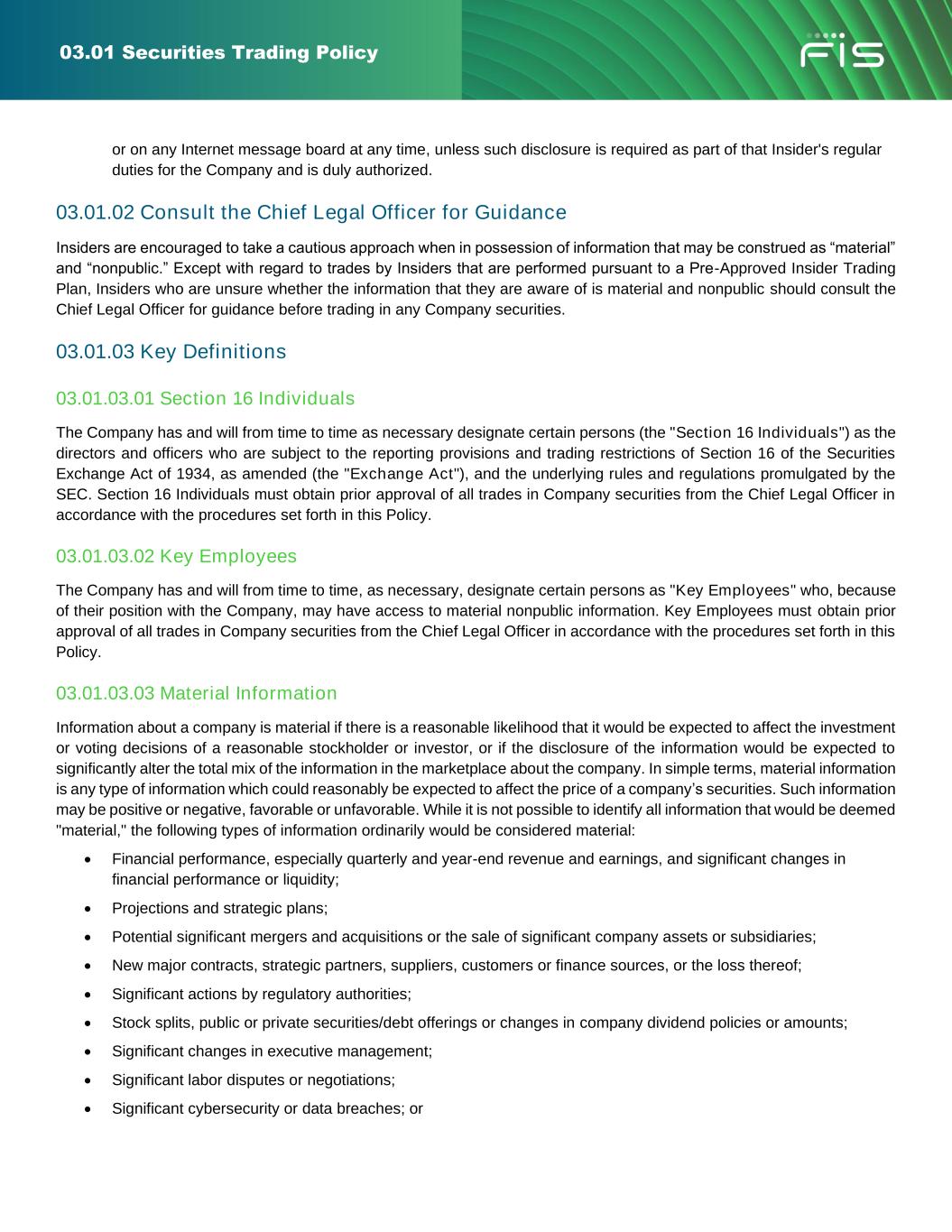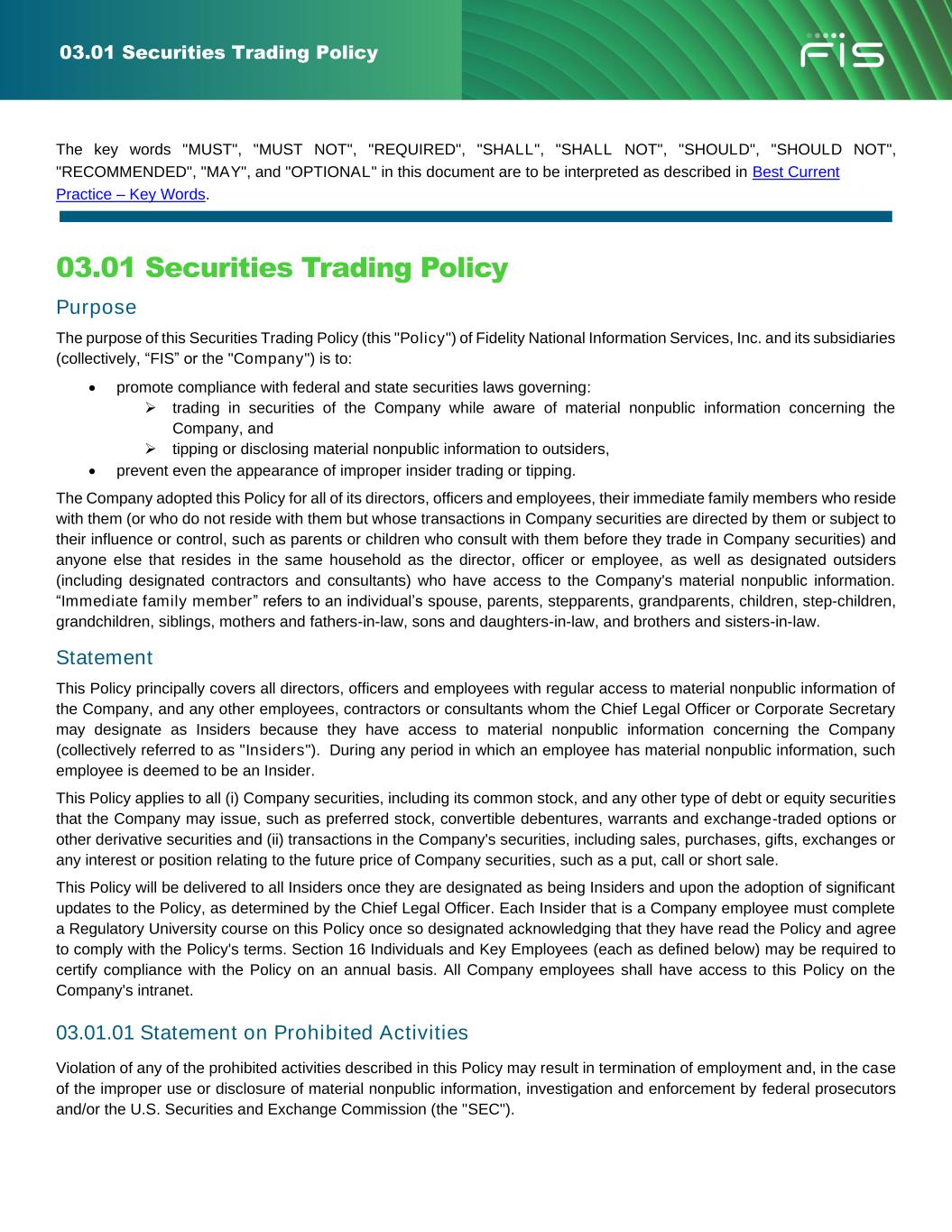 03.01 Securities Trading Policy The key words "MUST", "MUST NOT", "REQUIRED", "SHALL", "SHALL NOT", "SHOULD", "SHOULD NOT", "RECOMMENDED", "MAY", and "OPTIONAL" in this document are to be interpreted as described in Best Current Practice – Key Words. 03.01 Securities Trading Policy Purpose The purpose of this Securities Trading Policy (this "Policy") of Fidelity National Information Services, Inc. and its subsidiaries (collectively, “FIS” or the "Company") is to: • promote compliance with federal and state securities laws governing: ➢ trading in securities of the Company while aware of material nonpublic information concerning the Company, and ➢ tipping or disclosing material nonpublic information to outsiders, • prevent even the appearance of improper insider trading or tipping. The Company adopted this Policy for all of its directors, officers and employees, their immediate family members who reside with them (or who do not reside with them but whose transactions in Company securities are directed by them or subject to their influence or control, such as parents or children who consult with them before they trade in Company securities) and anyone else that resides in the same household as the director, officer or employee, as well as designated outsiders (including designated contractors and consultants) who have access to the Company's material nonpublic information. “Immediate family member” refers to an individual’s spouse, parents, stepparents, grandparents, children, step-children, grandchildren, siblings, mothers and fathers-in-law, sons and daughters-in-law, and brothers and sisters-in-law. Statement This Policy principally covers all directors, officers and employees with regular access to material nonpublic information of the Company, and any other employees, contractors or consultants whom the Chief Legal Officer or Corporate Secretary may designate as Insiders because they have access to material nonpublic information concerning the Company (collectively referred to as "Insiders"). During any period in which an employee has material nonpublic information, such employee is deemed to be an Insider. This Policy applies to all (i) Company securities, including its common stock, and any other type of debt or equity securities that the Company may issue, such as preferred stock, convertible debentures, warrants and exchange-traded options or other derivative securities and (ii) transactions in the Company's securities, including sales, purchases, gifts, exchanges or any interest or position relating to the future price of Company securities, such as a put, call or short sale. This Policy will be delivered to all Insiders once they are designated as being Insiders and upon the adoption of significant updates to the Policy, as determined by the Chief Legal Officer. Each Insider that is a Company employee must complete a Regulatory University course on this Policy once so designated acknowledging that they have read the Policy and agree to comply with the Policy's terms. Section 16 Individuals and Key Employees (each as defined below) may be required to certify compliance with the Policy on an annual basis. All Company employees shall have access to this Policy on the Company's intranet. 03.01.01 Statement on Prohibited Activities Violation of any of the prohibited activities described in this Policy may result in termination of employment and, in the case of the improper use or disclosure of material nonpublic information, investigation and enforcement by federal prosecutors and/or the U.S. Securities and Exchange Commission (the "SEC").