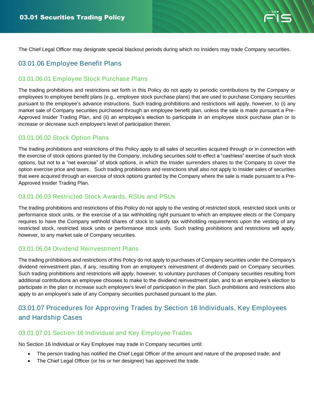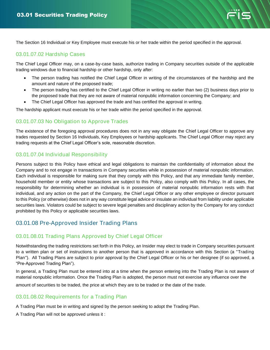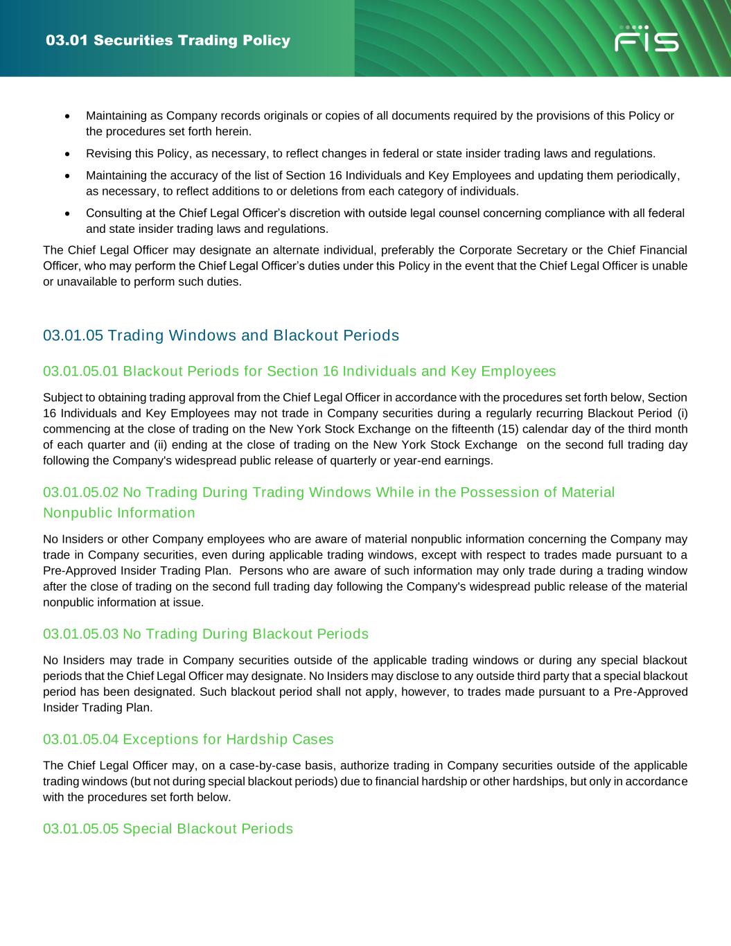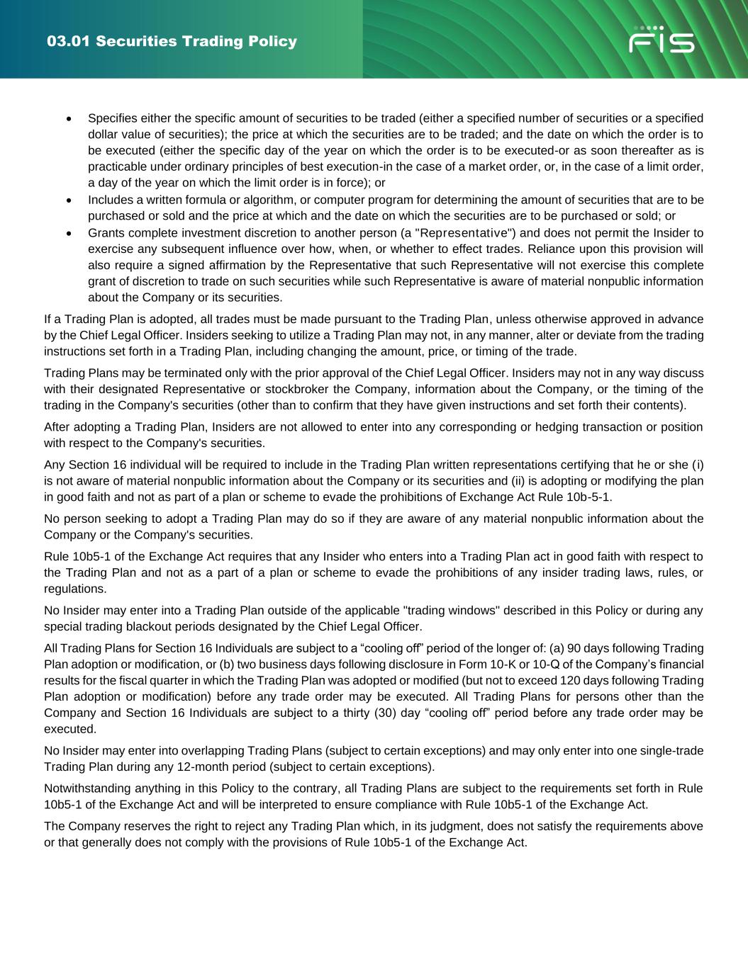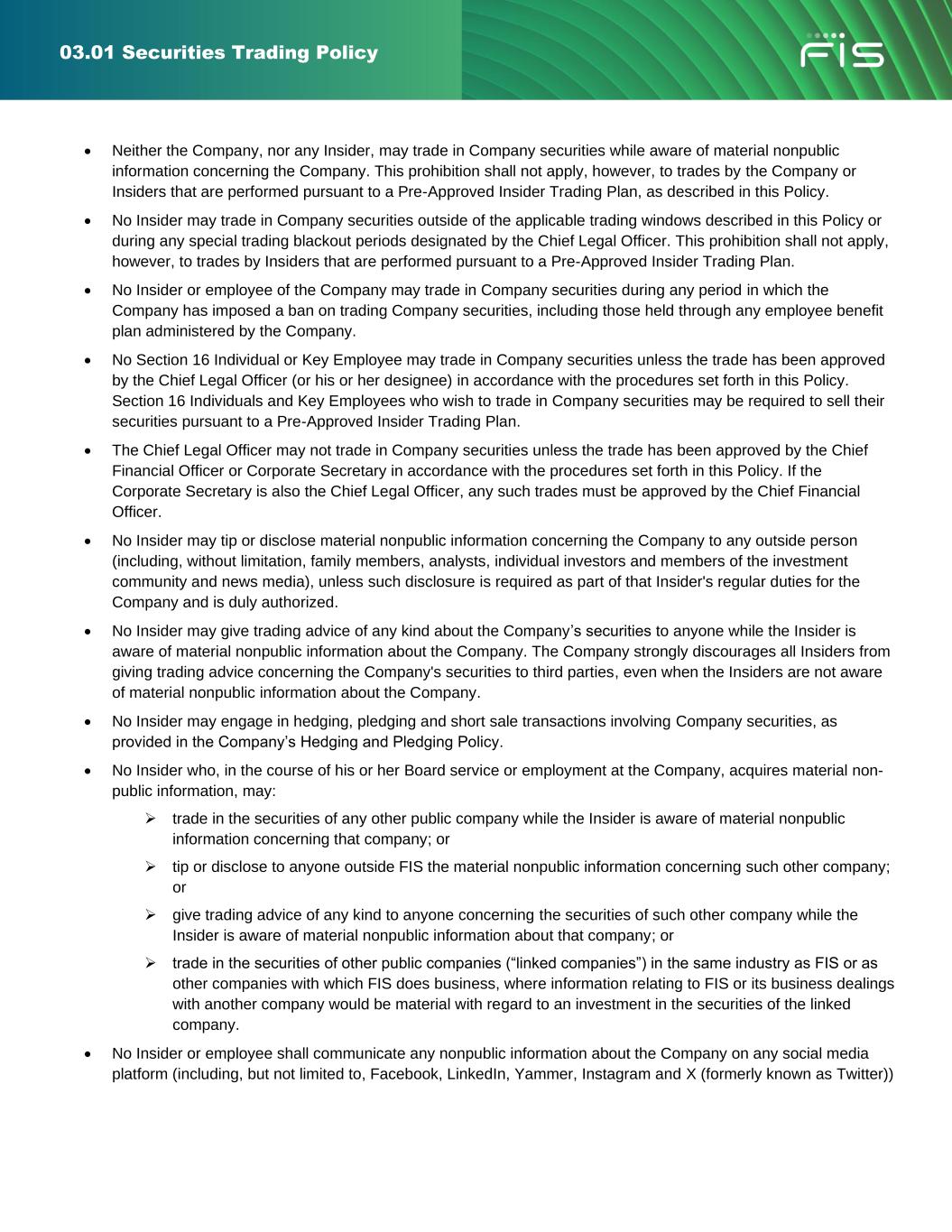 03.01 Securities Trading Policy • Neither the Company, nor any Insider, may trade in Company securities while aware of material nonpublic information concerning the Company. This prohibition shall not apply, however, to trades by the Company or Insiders that are performed pursuant to a Pre-Approved Insider Trading Plan, as described in this Policy. • No Insider may trade in Company securities outside of the applicable trading windows described in this Policy or during any special trading blackout periods designated by the Chief Legal Officer. This prohibition shall not apply, however, to trades by Insiders that are performed pursuant to a Pre-Approved Insider Trading Plan. • No Insider or employee of the Company may trade in Company securities during any period in which the Company has imposed a ban on trading Company securities, including those held through any employee benefit plan administered by the Company. • No Section 16 Individual or Key Employee may trade in Company securities unless the trade has been approved by the Chief Legal Officer (or his or her designee) in accordance with the procedures set forth in this Policy. Section 16 Individuals and Key Employees who wish to trade in Company securities may be required to sell their securities pursuant to a Pre-Approved Insider Trading Plan. • The Chief Legal Officer may not trade in Company securities unless the trade has been approved by the Chief Financial Officer or Corporate Secretary in accordance with the procedures set forth in this Policy. If the Corporate Secretary is also the Chief Legal Officer, any such trades must be approved by the Chief Financial Officer. • No Insider may tip or disclose material nonpublic information concerning the Company to any outside person (including, without limitation, family members, analysts, individual investors and members of the investment community and news media), unless such disclosure is required as part of that Insider's regular duties for the Company and is duly authorized. • No Insider may give trading advice of any kind about the Company’s securities to anyone while the Insider is aware of material nonpublic information about the Company. The Company strongly discourages all Insiders from giving trading advice concerning the Company's securities to third parties, even when the Insiders are not aware of material nonpublic information about the Company. • No Insider may engage in hedging, pledging and short sale transactions involving Company securities, as provided in the Company’s Hedging and Pledging Policy. • No Insider who, in the course of his or her Board service or employment at the Company, acquires material non- public information, may: ➢ trade in the securities of any other public company while the Insider is aware of material nonpublic information concerning that company; or ➢ tip or disclose to anyone outside FIS the material nonpublic information concerning such other company; or ➢ give trading advice of any kind to anyone concerning the securities of such other company while the Insider is aware of material nonpublic information about that company; or ➢ trade in the securities of other public companies (“linked companies”) in the same industry as FIS or as other companies with which FIS does business, where information relating to FIS or its business dealings with another company would be material with regard to an investment in the securities of the linked company. • No Insider or employee shall communicate any nonpublic information about the Company on any social media platform (including, but not limited to, Facebook, LinkedIn, Yammer, Instagram and X (formerly known as Twitter))