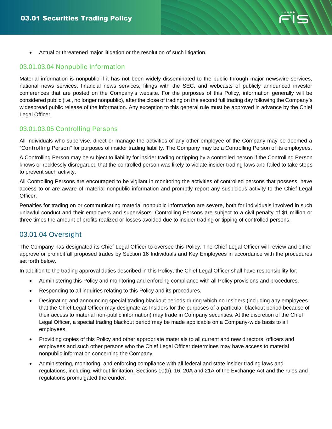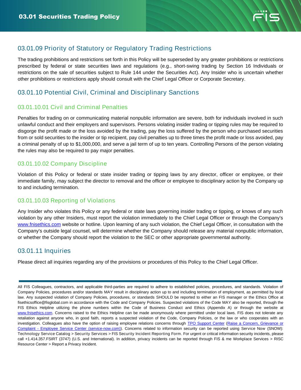 03.01 Securities Trading Policy 03.01.09 Priority of Statutory or Regulatory Trading Restrictions The trading prohibitions and restrictions set forth in this Policy will be superseded by any greater prohibitions or restrictions prescribed by federal or state securities laws and regulations (e.g., short-swing trading by Section 16 Individuals or restrictions on the sale of securities subject to Rule 144 under the Securities Act). Any Insider who is uncertain whether other prohibitions or restrictions apply should consult with the Chief Legal Officer or Corporate Secretary. 03.01.10 Potential Civil, Criminal and Disciplinary Sanctions 03.01.10.01 Civil and Criminal Penalties Penalties for trading on or communicating material nonpublic information are severe, both for individuals involved in such unlawful conduct and their employers and supervisors. Persons violating insider trading or tipping rules may be required to disgorge the profit made or the loss avoided by the trading, pay the loss suffered by the person who purchased securities from or sold securities to the insider or tip recipient, pay civil penalties up to three times the profit made or loss avoided, pay a criminal penalty of up to $1,000,000, and serve a jail term of up to ten years. Controlling Persons of the person violating the rules may also be required to pay major penalties. 03.01.10.02 Company Discipline Violation of this Policy or federal or state insider trading or tipping laws by any director, officer or employee, or their immediate family, may subject the director to removal and the officer or employee to disciplinary action by the Company up to and including termination. 03.01.10.03 Reporting of Violations Any Insider who violates this Policy or any federal or state laws governing insider trading or tipping, or knows of any such violation by any other Insiders, must report the violation immediately to the Chief Legal Officer or through the Company's www.fnisethics.com website or hotline. Upon learning of any such violation, the Chief Legal Officer, in consultation with the Company's outside legal counsel, will determine whether the Company should release any material nonpublic information, or whether the Company should report the violation to the SEC or other appropriate governmental authority. 03.01.11 Inquiries Please direct all inquiries regarding any of the provisions or procedures of this Policy to the Chief Legal Officer. All FIS Colleagues, contractors, and applicable third-parties are required to adhere to established policies, procedures, and standards. Violation of Company Policies, procedures and/or standards MAY result in disciplinary action up to and including termination of employment, as permitted by local law. Any suspected violation of Company Policies, procedures, or standards SHOULD be reported to either an FIS manager or the Ethics Office at fisethicsoffice@fisglobal.com in accordance with the Code and Company Policies. Suspected violations of the Code MAY also be reported, through the FIS Ethics Helpline utilizing the phone numbers within the Code of Business Conduct and Ethics (Appendix A) or through the website at www.fnisethics.com. Concerns raised to the Ethics Helpline can be made anonymously where permitted under local laws. FIS does not tolerate any retaliation against anyone who, in good faith, reports a suspected violation of the Code, Company Policies, or the law or who cooperates with an investigation. Colleagues also have the option of raising employee relations concerns through TPO Support Center (Raise a Concern, Grievance or Complaint - Employee Service Center (service-now.com)). Concerns related to information security can be reported using Service Now (SNOW): Technology Service Catalog > Security Services > FIS Security Incident Reporting Form. For urgent or critical information security incidents, please call +1.414.357.FSIRT (3747) (U.S. and International). In addition, privacy incidents can be reported through FIS & me Workplace Services > RISC Resource Center > Report a Privacy Incident.