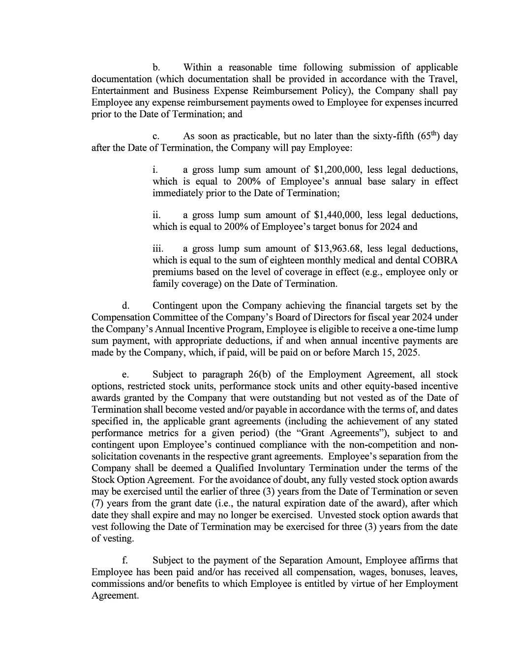 b. Within a reasonable time following submission of applicable documentation (which documentation shall be provided in accordance with the Travel, Entertainment and Business Expense Reimbursement Policy), the Company shall pay Employee any expense reimbursement payments owed to Employee for expenses incurred prior to the Date of Termination; and c. As soon as practicable, but no later than the sixty-fifth (65th) day after the Date of Termination, the Company will pay Employee: 1. a gross lump sum amount of $1,200,000, less legal deductions, which is equal to 200% of Employee's annual base salary in effect immediately prior to the Date of Termination; ii. a gross lump sum amount of $1,440,000, less legal deductions, which is equal to 200% of Employee's target bonus for 2024 and 111. a gross lump sum amount of $13,963.68, less legal deductions, which is equal to the sum of eighteen monthly medical and dental COBRA premiums based on the level of coverage in effect ( e.g., employee only or family coverage) on the Date of Termination. d. Contingent upon the Company achieving the financial targets set by the Compensation Committee of the Company's Board of Directors for fiscal year 2024 under the Company's Annual Incentive Program, Employee is eligible to receive a one-time lump sum payment, with appropriate deductions, if and when annual incentive payments are made by the Company, which, if paid, will be paid on or before March 15, 2025. e. Subject to paragraph 26(b) of the Employment Agreement, all stock options, restricted stock units, performance stock units and other equity-based incentive awards granted by the Company that were outstanding but not vested as of the Date of Termination shall become vested and/or payable in accordance with the terms of, and dates specified in, the applicable grant agreements (including the achievement of any stated performance metrics for a given period) (the "Grant Agreements"), subject to and contingent upon Employee's continued compliance with the non-competition and non solicitation covenants in the respective grant agreements. Employee's separation from the Company shall be deemed a Qualified Involuntary Termination under the terms of the Stock Option Agreement. For the avoidance of doubt, any fully vested stock option awards may be exercised until the earlier of three (3) years from the Date of Termination or seven (7) years from the grant date (i.e., the natural expiration date of the award), after which date they shall expire and may no longer be exercised. Unvested stock option awards that vest following the Date of Termination may be exercised for three (3) years from the date of vesting. f. Subject to the payment of the Separation Amount, Employee affirms that Employee has been paid and/or has received all compensation, wages, bonuses, leaves, commissions and/or benefits to which Employee is entitled by virtue of her Employment Agreement.
