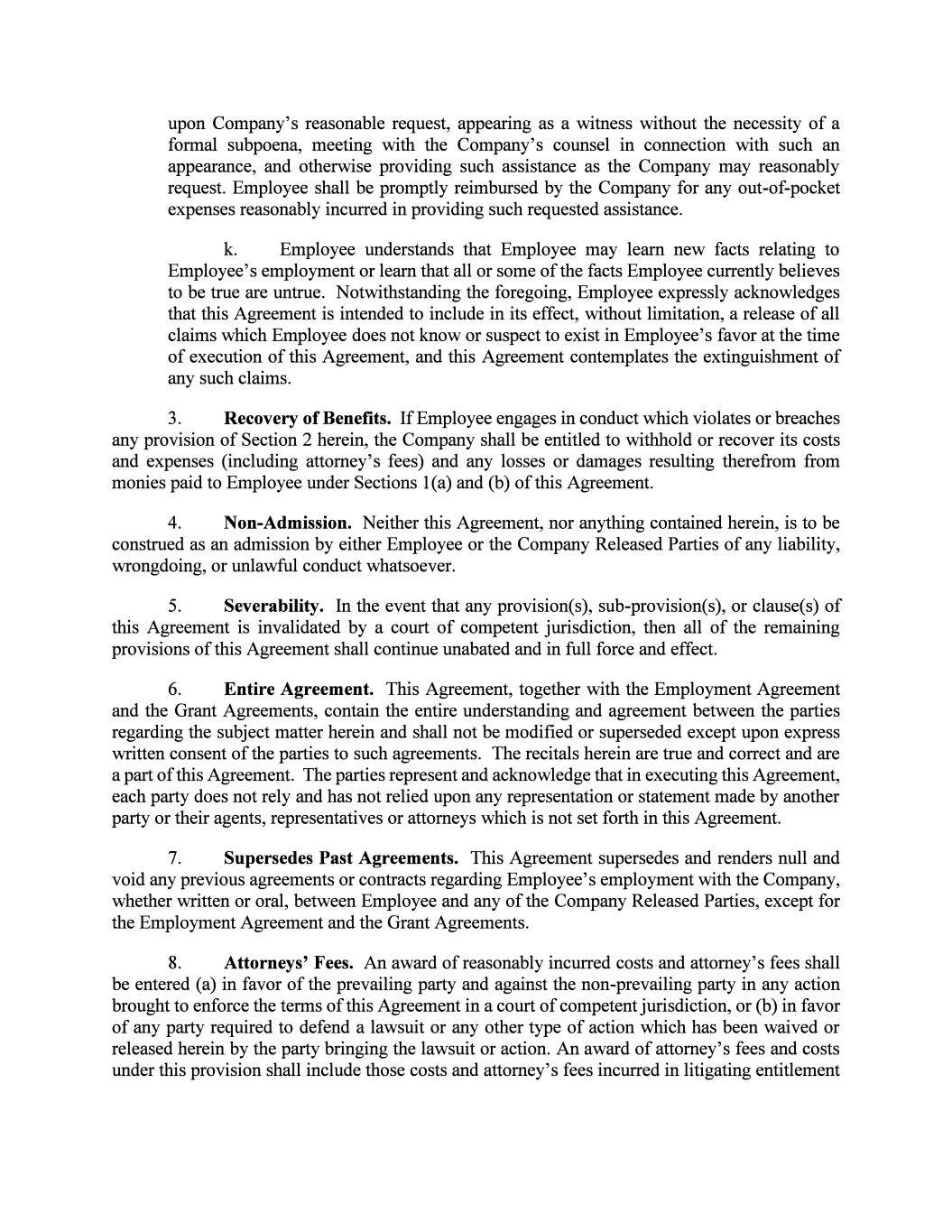 upon Company's reasonable request, appearing as a witness without the necessity of a formal subpoena, meeting with the Company's counsel in connection with such an appearance, and otherwise providing such assistance as the Company may reasonably request. Employee shall be promptly reimbursed by the Company for any out-of-pocket expenses reasonably incurred in providing such requested assistance. k. Employee understands that Employee may learn new facts relating to Employee's employment or learn that all or some of the facts Employee currently believes to be true are untrue. Notwithstanding the foregoing, Employee expressly acknowledges that this Agreement is intended to include in its effect, without limitation, a release of all claims which Employee does not know or suspect to exist in Employee's favor at the time of execution of this Agreement, and this Agreement contemplates the extinguishment of any such claims. 3. Recovery of Benefits. If Employee engages in conduct which violates or breaches any provision of Section 2 herein, the Company shall be entitled to withhold or recover its costs and expenses (including attorney's fees) and any losses or damages resulting therefrom from monies paid to Employee under Sections l(a) and (b) of this Agreement. 4. Non-Admission. Neither this Agreement, nor anything contained herein, is to be construed as an admission by either Employee or the Company Released Parties of any liability, wrongdoing, or unlawful conduct whatsoever. 5. Severability. In the event that any provision(s), sub-provision(s), or clause(s) of this Agreement is invalidated by a court of competent jurisdiction, then all of the remaining provisions of this Agreement shall continue unabated and in full force and effect. 6. Entire Agreement. This Agreement, together with the Employment Agreement and the Grant Agreements, contain the entire understanding and agreement between the parties regarding the subject matter herein and shall not be modified or superseded except upon express written consent of the parties to such agreements. The recitals herein are true and correct and are a part of this Agreement. The parties represent and acknowledge that in executing this Agreement, each party does not rely and has not relied upon any representation or statement made by another party or their agents, representatives or attorneys which is not set forth in this Agreement. 7. Supersedes Past Agreements. This Agreement supersedes and renders null and void any previous agreements or contracts regarding Employee's employment with the Company, whether written or oral, between Employee and any of the Company Released Parties, except for the Employment Agreement and the Grant Agreements. 8. Attorneys' Fees. An award of reasonably incurred costs and attorney's fees shall be entered (a) in favor of the prevailing party and against the non-prevailing party in any action brought to enforce the terms of this Agreement in a court of competent jurisdiction, or (b) in favor of any party required to defend a lawsuit or any other type of action which has been waived or released herein by the party bringing the lawsuit or action. An award of attorney's fees and costs under this provision shall include those costs and attorney's fees incurred in litigating entitlement