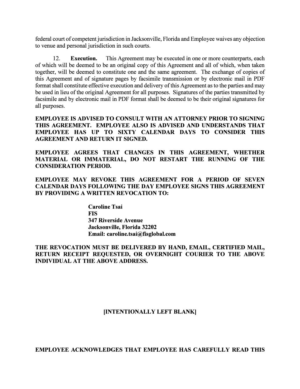 federal court of competent jurisdiction in Jacksonville, Florida and Employee waives any objection to venue and personal jurisdiction in such courts. 12. Execution. This Agreement may be executed in one or more counterparts, each of which will be deemed to be an original copy of this Agreement and all of which, when taken together, will be deemed to constitute one and the same agreement. The exchange of copies of this Agreement and of signature pages by facsimile transmission or by electronic mail in PDF format shall constitute effective execution and delivery of this Agreement as to the parties and may be used in lieu of the original Agreement for all purposes. Signatures of the parties transmitted by facsimile and by electronic mail in PDF format shall be deemed to be their original signatures for all purposes. EMPLOYEE IS ADVISED TO CONSULT WITH AN ATTORNEY PRIOR TO SIGNING THIS AGREEMENT. EMPLOYEE ALSO IS ADVISED AND UNDERSTANDS THAT EMPLOYEE HAS UP TO SIXTY CALENDAR DAYS TO CONSIDER THIS AGREEMENT AND RETURN IT SIGNED. EMPLOYEE AGREES THAT CHANGES IN TIDS AGREEMENT, WHETHER MATERIAL OR IMMATERIAL, DO NOT RESTART THE RUNNING OF THE CONSIDERATION PERIOD. EMPLOYEE MAY REVOKE THIS AGREEMENT FOR A PERIOD OF SEVEN CALENDAR DAYS FOLLOWING THE DAY EMPLOYEE SIGNS THIS AGREEMENT BY PROVIDING A WRITTEN REVOCATION TO: Caroline Tsai FIS 347 Riverside Avenue Jacksonville, Florida 32202 Email: caroline.tsai@fisglobal.com THE REVOCATION MUST BE DELIVERED BY HAND, EMAIL, CERTIFIED MAIL, RETURN RECEIPT REQUESTED, OR OVERNIGHT COURIER TO THE ABOVE INDIVIDUAL AT THE ABOVE ADDRESS. [INTENTIONALLY LEFT BLANK] EMPLOYEE ACKNOWLEDGES THAT EMPLOYEE HAS CAREFULLY READ THIS