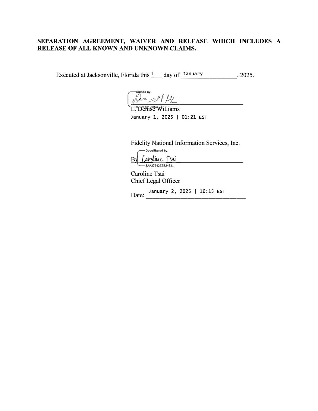 SEPARATION AGREEMENT, WAIVER AND RELEASE WIDCH INCLUDES A RELEASE OF ALL KNOWN AND UNKNOWN CLAIMS. Executed at Jacksonville, Florida this _1_ day of _J_a _n_ua_r_Y ___ � 2025. �� January 1, 2025 I 01:21 EST Fidelity National Information Services, Inc. If Doc;uSigned by; B&LilM- Utti 3AA27642EE32483 ... Caroline Tsai Chief Legal Officer January 2, 2025 I 16:15 EST Date: --------------