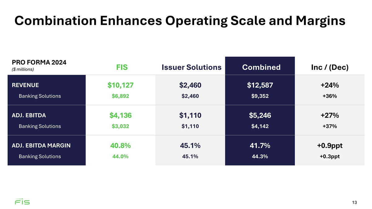 Unlocking Addressable Market with Large Banks Cross Sell White Space Total ‘Payments’ $1.1B $850M $200M Credit + Debit ‘Cap Markets’ $300M $530M $830M Lending + Trading ‘Banking’ $450M $250M $200M Core + Network Of the top 150 large banks FIS provides at least one Issuer Solutions provides at FIS & Issuer Solutions provide product to 50% least one product to 25% at least one product to 60% 12 Cross sell and white space opportunity across top 150 large banks ($m)