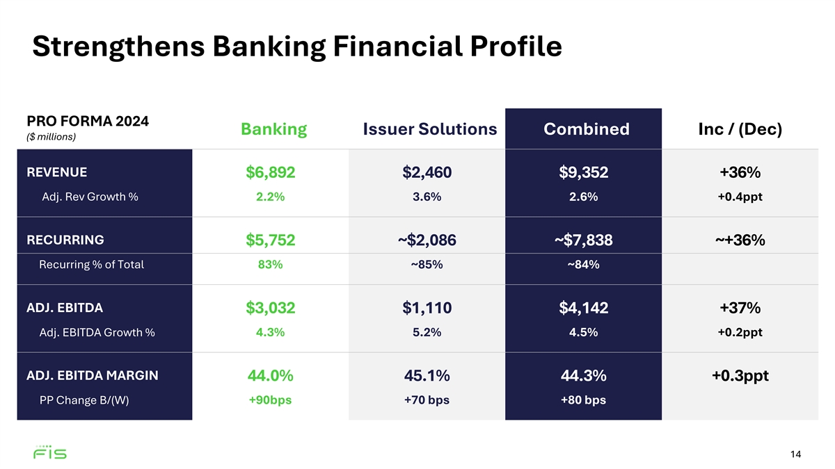 Combination Enhances Operating Scale and Margins PRO FORMA 2024 FIS Issuer Solutions Combined Inc / (Dec) ($ millions) REVENUE $10,127 $2,460 $12,587 +24% Banking Solutions $6,892 $2,460 $9,352 +36% ADJ. EBITDA $4,136 $1,110 $5,246 +27% Banking Solutions $3,032 $1,110 $4,142 +37% ADJ. EBITDA MARGIN 40.8% 45.1% 41.7% +0.9ppt Banking Solutions 44.0% 45.1% 44.3% +0.3ppt 13