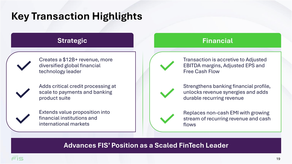 Key Transaction Highlights Strategic Financial Creates a $12B+ revenue, more Transaction is accretive to Adjusted diversified global financial EBITDA margins, Adjusted EPS and technology leader Free Cash Flow Adds critical credit processing at Strengthens banking financial profile, scale to payments and banking unlocks revenue synergies and adds product suite durable recurring revenue Extends value proposition into Replaces non-cash EMI with growing financial institutions and stream of recurring revenue and cash international markets flows Advances FIS’ Position as a Scaled FinTech Leader 19 19