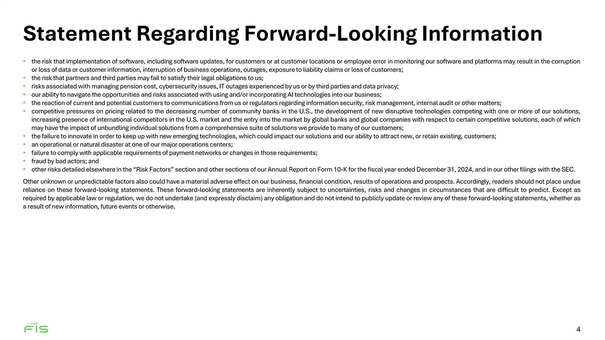 Statement Regarding Forward-Looking Information This communication contains “forward-looking statements” within the meaning of the U.S. federal securities laws. Statements that are not historical facts, as well as other statements about our expectations, beliefs, intentions, or strategies regarding the future, or other characterizations of future events or circumstances, are forward-looking statements. Forward-looking statements include statements about anticipated financial outcomes, including any earnings outlook or projections, projected revenue or expense synergies or dis-synergies, business and market conditions, outlook, foreign currency exchange rates, deleveraging plans, expected dividends and share repurchases of the Company, the Company’s sales pipeline and anticipated profitability and growth, plans, strategies and objectives for future operations, strategic value creation, risk profile and investment strategies, any statements regarding future economic conditions or performance and any statements with respect to the future impacts of the Worldpay Sale or any agreements or arrangements entered into in connection with such transaction. These statements may be identified by words such as “expect,” “anticipate,” “intend,” “plan,” “believe,” “will,” “should,” “could,” “would,” “project,” “continue,” “likely,” and similar expressions, and include statements reflecting future results or outlook, statements of outlook and various accruals and estimates. These statements relate to future events and our future results and involve a number of risks and uncertainties. Forward-looking statements are based on management’s beliefs as well as assumptions made by, and information currently available to, management. Actual results, performance or achievement could differ materially from these forward-looking statements. The risks and uncertainties to which forward-looking statements are subject include the following, without limitation: • changes in general economic, business and political conditions, a recession, intensified or expanded international hostilities, acts of terrorism, increased rates of inflation or interest, changes in either or both the United States and international lending, capital and financial markets or currency fluctuations; • the risk that acquired businesses will not be integrated successfully or that the integration will be more costly or more time-consuming and complex than anticipated; • the risk that cost savings and synergies anticipated to be realized from acquisitions may not be fully realized or may take longer to realize than expected or that costs may be greater than anticipated; • the risks of doing business internationally; • the effect of legislative initiatives or proposals, statutory changes, governmental or applicable regulations and/or changes in industry requirements, including privacy, data protection, cybersecurity, cyber resilience and AI laws and regulations; • our ability to comply with climate change legal and regulatory requirements and to maintain practices that meet our stakeholders’ evolving expectations; • the risks of reduction in revenue from the elimination of existing and potential customers due to consolidation in, or new laws or regulations affecting, the banking, retail and financial services industries or due to financial failures or other setbacks suffered by firms in those industries; • changes in the growth rates of the markets for our solutions; • the amount, declaration and payment of future dividends is at the discretion of our Board of Directors and depends on, among other things, our investment opportunities, results of operations, financial condition, cash requirements, future prospects, and other factors that may be considered relevant by our Board of Directors, including legal and contractual restrictions; • the amount and timing of any future share repurchases is subject to, among other things, our share price, our other investment opportunities and cash requirements, our results of operations and financial condition, our future prospects and other factors that may be considered relevant by our Board of Directors and management; • failures to adapt our solutions to changes in technology or in the marketplace; • internal or external security or privacy breaches of our systems, including those relating to unauthorized access, theft, corruption or loss of personal information and computer viruses and other malware affecting our software or platforms, and the reactions of customers, card associations, government regulators and others to any such events; 3