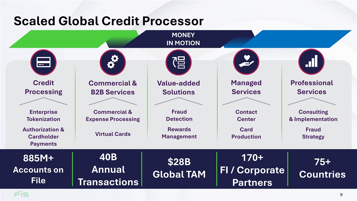 Strengthens Portfolio at Attractive Multiples FIS will sell its minority stake in Concurrently, FIS will acquire ATTRACTIVE MULTIPLES Worldpay to Global Payments 100% stake in Global Payments’ 1 ISSUER SOLUTIONS EV / MULTIPLE Issuer Solutions business • Enterprise Value of $24.25B, representing sale multiple of ~10.5x, $13.5B | ~10x • Acquisition to be financed with a adjusted for control premium payment combination of debt and FIS’ 45% $12.0B | ~9x* to GTCR interest in Worldpay *Adjusted for ~$1.5B tax benefit • $6.6B of pre-tax value compared to • Transaction to generate annual tax $3.9B of carrying value step-up of ~$185M, representing 2 present value of ~$1.5B in tax assets WORLDPAY EV / MULTIPLE • Represents monetization of Worldpay stake at a premium to 9.8x multiple at • Expect to realize $45M revenue and $24.25B | ~10.5x time of majority stake sale $125M OpEx synergies within 3 years post-closing; long-term revenue synergies in excess of $125M FINANCIAL IMPACT 3 Expected to close in 1H 2026 Accretive to Adjusted EPS in first 12 months 1 Multiple represents $12.0B net purchase price (excluding $1.5B of anticipated tax benefits) and expected 2025 synergized EBITDA. 2 Multiple represents implied EV on FIS pre-tax value of $6.6B and expected 2025 EBITDA. 8 3 Pending satisfaction of customary closing conditions, regulatory approvals, and sale of GTCR’s 55% stake in Worldpay to Global Payments.