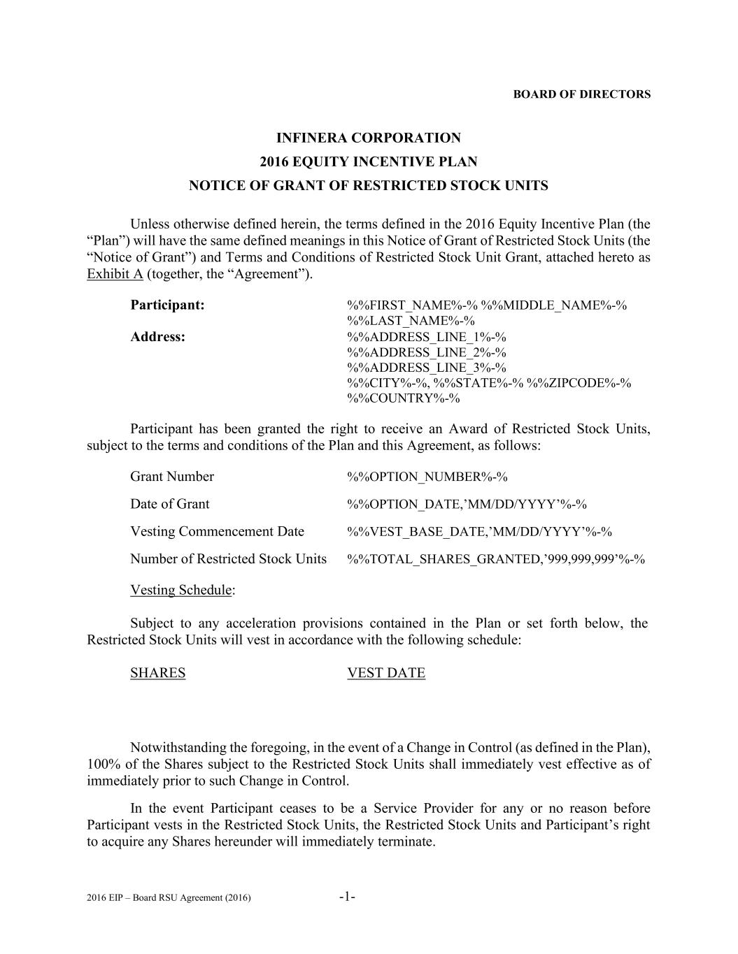 BOARD OF DIRECTORS 2016 EIP – Board RSU Agreement (2016) -1- INFINERA CORPORATION 2016 EQUITY INCENTIVE PLAN NOTICE OF GRANT OF RESTRICTED STOCK UNITS Unless otherwise defined herein, the terms defined in the 2016 Equity Incentive Plan (the “Plan”) will have the same defined meanings in this Notice of Grant of Restricted Stock Units (the “Notice of Grant”) and Terms and Conditions of Restricted Stock Unit Grant, attached hereto as Exhibit A (together, the “Agreement”). Participant: %%FIRST_NAME%-% %%MIDDLE_NAME%-% %%LAST_NAME%-% Address: %%ADDRESS_LINE_1%-% %%ADDRESS_LINE_2%-% %%ADDRESS_LINE_3%-% %%CITY%-%, %%STATE%-% %%ZIPCODE%-% %%COUNTRY%-% Participant has been granted the right to receive an Award of Restricted Stock Units, subject to the terms and conditions of the Plan and this Agreement, as follows: Grant Number %%OPTION_NUMBER%-% Date of Grant %%OPTION_DATE,’MM/DD/YYYY’%-% Vesting Commencement Date %%VEST_BASE_DATE,’MM/DD/YYYY’%-% Number of Restricted Stock Units %%TOTAL_SHARES_GRANTED,’999,999,999’%-% Vesting Schedule: Subject to any acceleration provisions contained in the Plan or set forth below, the Restricted Stock Units will vest in accordance with the following schedule: SHARES VEST DATE Notwithstanding the foregoing, in the event of a Change in Control (as defined in the Plan), 100% of the Shares subject to the Restricted Stock Units shall immediately vest effective as of immediately prior to such Change in Control. In the event Participant ceases to be a Service Provider for any or no reason before Participant vests in the Restricted Stock Units, the Restricted Stock Units and Participant’s right to acquire any Shares hereunder will immediately terminate.