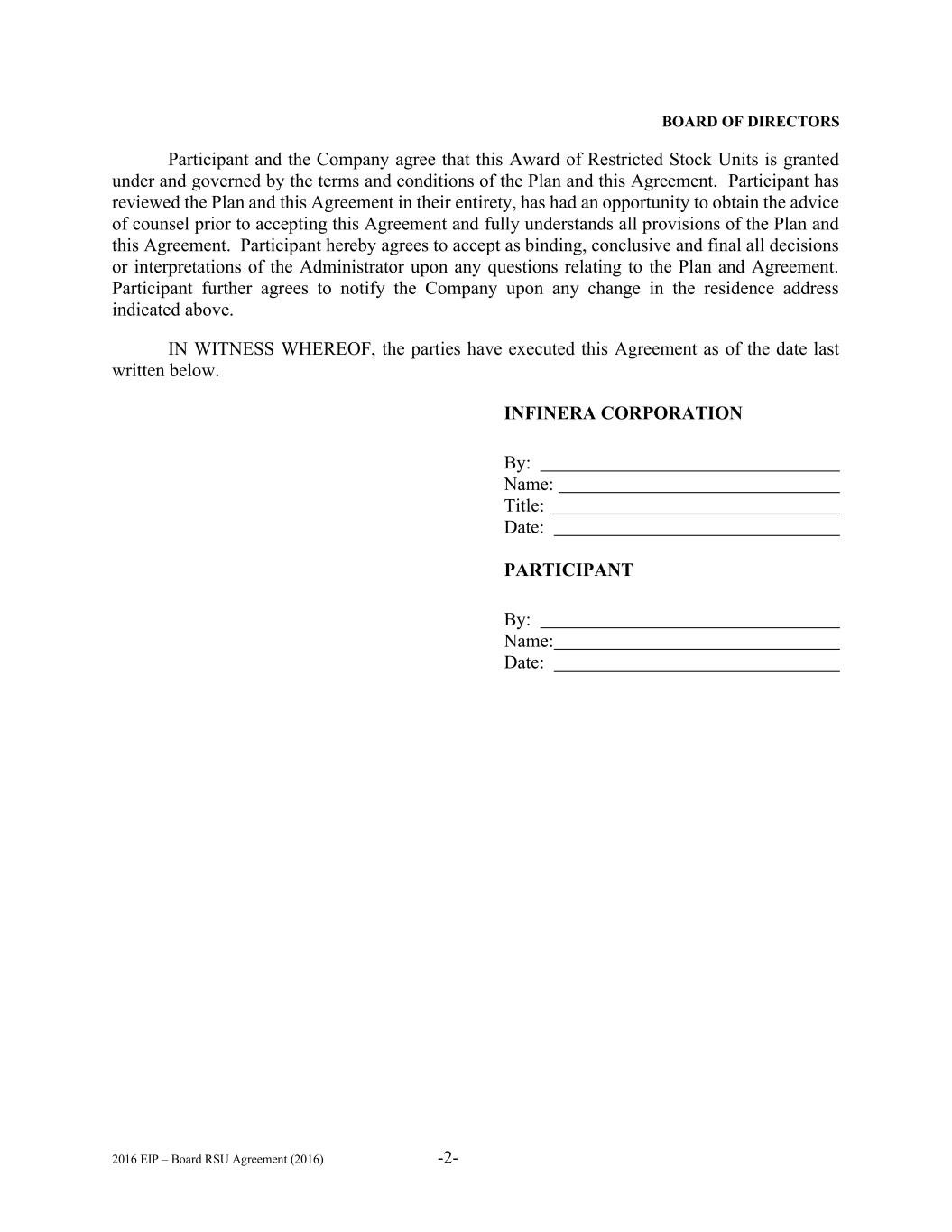 BOARD OF DIRECTORS 2016 EIP – Board RSU Agreement (2016) -2- Participant and the Company agree that this Award of Restricted Stock Units is granted under and governed by the terms and conditions of the Plan and this Agreement. Participant has reviewed the Plan and this Agreement in their entirety, has had an opportunity to obtain the advice of counsel prior to accepting this Agreement and fully understands all provisions of the Plan and this Agreement. Participant hereby agrees to accept as binding, conclusive and final all decisions or interpretations of the Administrator upon any questions relating to the Plan and Agreement. Participant further agrees to notify the Company upon any change in the residence address indicated above. IN WITNESS WHEREOF, the parties have executed this Agreement as of the date last written below. INFINERA CORPORATION By: Name: Title: Date: PARTICIPANT By: Name: Date: