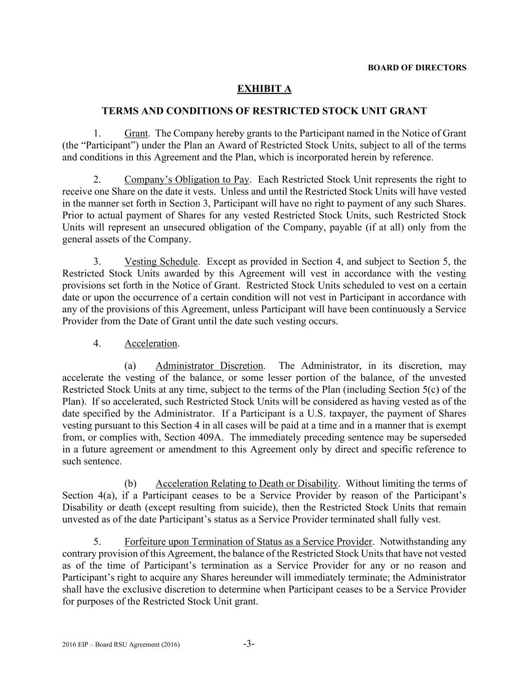 BOARD OF DIRECTORS 2016 EIP – Board RSU Agreement (2016) -3- EXHIBIT A TERMS AND CONDITIONS OF RESTRICTED STOCK UNIT GRANT 1. Grant. The Company hereby grants to the Participant named in the Notice of Grant (the “Participant”) under the Plan an Award of Restricted Stock Units, subject to all of the terms and conditions in this Agreement and the Plan, which is incorporated herein by reference. 2. Company’s Obligation to Pay. Each Restricted Stock Unit represents the right to receive one Share on the date it vests. Unless and until the Restricted Stock Units will have vested in the manner set forth in Section 3, Participant will have no right to payment of any such Shares. Prior to actual payment of Shares for any vested Restricted Stock Units, such Restricted Stock Units will represent an unsecured obligation of the Company, payable (if at all) only from the general assets of the Company. 3. Vesting Schedule. Except as provided in Section 4, and subject to Section 5, the Restricted Stock Units awarded by this Agreement will vest in accordance with the vesting provisions set forth in the Notice of Grant. Restricted Stock Units scheduled to vest on a certain date or upon the occurrence of a certain condition will not vest in Participant in accordance with any of the provisions of this Agreement, unless Participant will have been continuously a Service Provider from the Date of Grant until the date such vesting occurs. 4. Acceleration. (a) Administrator Discretion. The Administrator, in its discretion, may accelerate the vesting of the balance, or some lesser portion of the balance, of the unvested Restricted Stock Units at any time, subject to the terms of the Plan (including Section 5(c) of the Plan). If so accelerated, such Restricted Stock Units will be considered as having vested as of the date specified by the Administrator. If a Participant is a U.S. taxpayer, the payment of Shares vesting pursuant to this Section 4 in all cases will be paid at a time and in a manner that is exempt from, or complies with, Section 409A. The immediately preceding sentence may be superseded in a future agreement or amendment to this Agreement only by direct and specific reference to such sentence. (b) Acceleration Relating to Death or Disability. Without limiting the terms of Section 4(a), if a Participant ceases to be a Service Provider by reason of the Participant’s Disability or death (except resulting from suicide), then the Restricted Stock Units that remain unvested as of the date Participant’s status as a Service Provider terminated shall fully vest. 5. Forfeiture upon Termination of Status as a Service Provider. Notwithstanding any contrary provision of this Agreement, the balance of the Restricted Stock Units that have not vested as of the time of Participant’s termination as a Service Provider for any or no reason and Participant’s right to acquire any Shares hereunder will immediately terminate; the Administrator shall have the exclusive discretion to determine when Participant ceases to be a Service Provider for purposes of the Restricted Stock Unit grant.