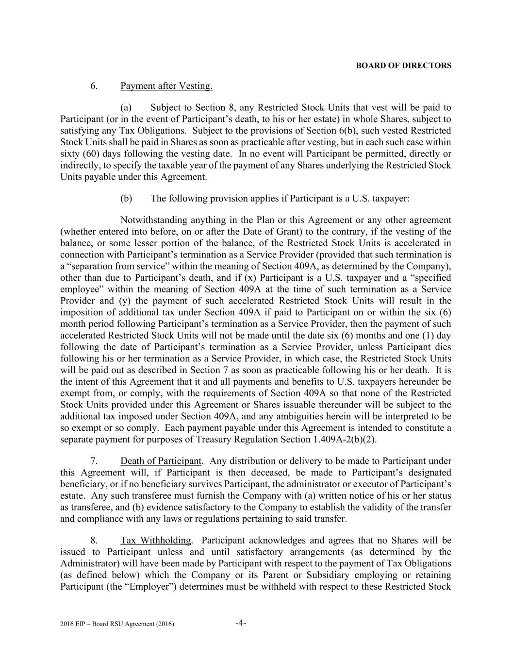 BOARD OF DIRECTORS 2016 EIP – Board RSU Agreement (2016) -4- 6. Payment after Vesting. (a) Subject to Section 8, any Restricted Stock Units that vest will be paid to Participant (or in the event of Participant’s death, to his or her estate) in whole Shares, subject to satisfying any Tax Obligations. Subject to the provisions of Section 6(b), such vested Restricted Stock Units shall be paid in Shares as soon as practicable after vesting, but in each such case within sixty (60) days following the vesting date. In no event will Participant be permitted, directly or indirectly, to specify the taxable year of the payment of any Shares underlying the Restricted Stock Units payable under this Agreement. (b) The following provision applies if Participant is a U.S. taxpayer: Notwithstanding anything in the Plan or this Agreement or any other agreement (whether entered into before, on or after the Date of Grant) to the contrary, if the vesting of the balance, or some lesser portion of the balance, of the Restricted Stock Units is accelerated in connection with Participant’s termination as a Service Provider (provided that such termination is a “separation from service” within the meaning of Section 409A, as determined by the Company), other than due to Participant’s death, and if (x) Participant is a U.S. taxpayer and a “specified employee” within the meaning of Section 409A at the time of such termination as a Service Provider and (y) the payment of such accelerated Restricted Stock Units will result in the imposition of additional tax under Section 409A if paid to Participant on or within the six (6) month period following Participant’s termination as a Service Provider, then the payment of such accelerated Restricted Stock Units will not be made until the date six (6) months and one (1) day following the date of Participant’s termination as a Service Provider, unless Participant dies following his or her termination as a Service Provider, in which case, the Restricted Stock Units will be paid out as described in Section 7 as soon as practicable following his or her death. It is the intent of this Agreement that it and all payments and benefits to U.S. taxpayers hereunder be exempt from, or comply, with the requirements of Section 409A so that none of the Restricted Stock Units provided under this Agreement or Shares issuable thereunder will be subject to the additional tax imposed under Section 409A, and any ambiguities herein will be interpreted to be so exempt or so comply. Each payment payable under this Agreement is intended to constitute a separate payment for purposes of Treasury Regulation Section 1.409A-2(b)(2). 7. Death of Participant. Any distribution or delivery to be made to Participant under this Agreement will, if Participant is then deceased, be made to Participant’s designated beneficiary, or if no beneficiary survives Participant, the administrator or executor of Participant’s estate. Any such transferee must furnish the Company with (a) written notice of his or her status as transferee, and (b) evidence satisfactory to the Company to establish the validity of the transfer and compliance with any laws or regulations pertaining to said transfer. 8. Tax Withholding. Participant acknowledges and agrees that no Shares will be issued to Participant unless and until satisfactory arrangements (as determined by the Administrator) will have been made by Participant with respect to the payment of Tax Obligations (as defined below) which the Company or its Parent or Subsidiary employing or retaining Participant (the “Employer”) determines must be withheld with respect to these Restricted Stock